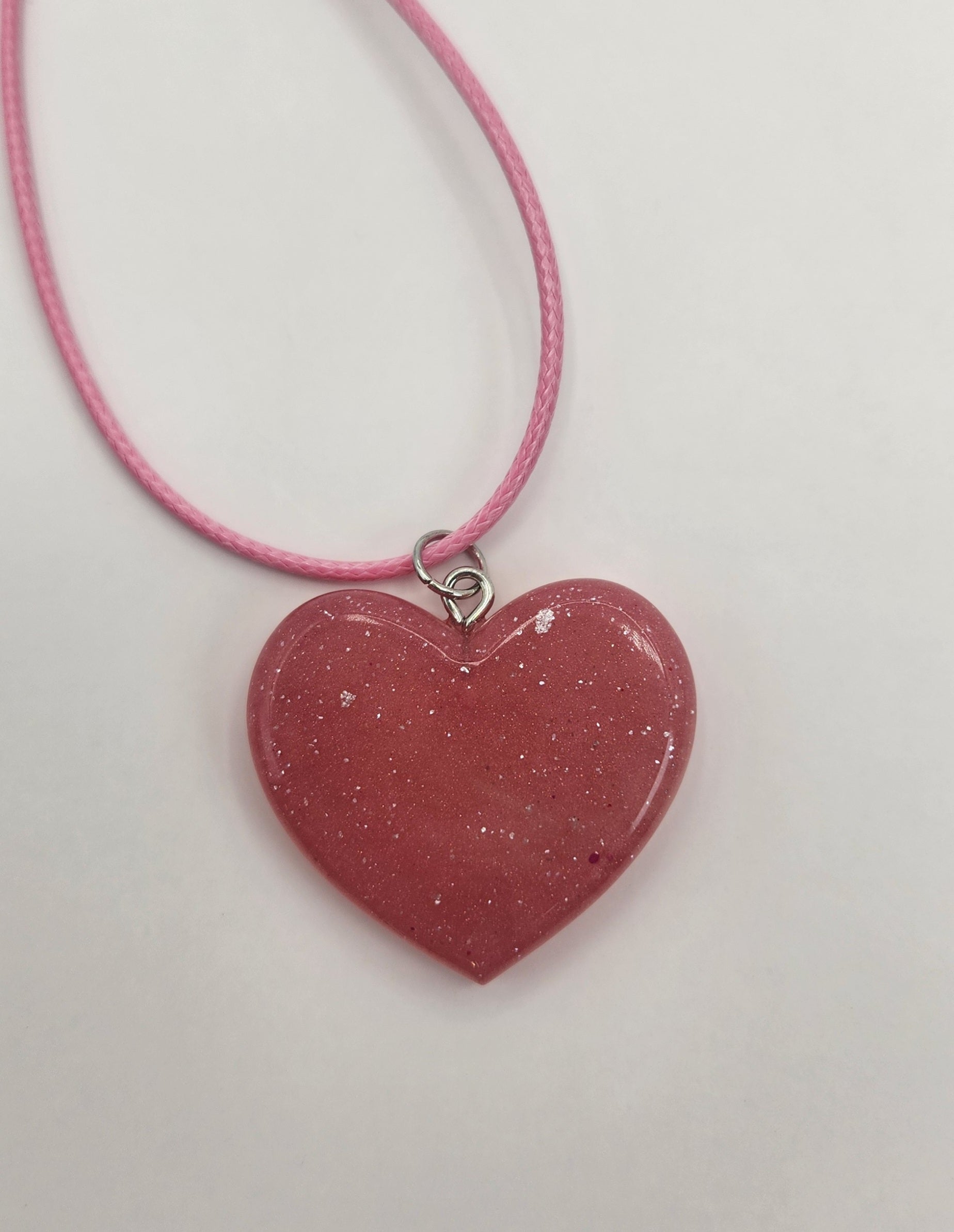 This adorable handmade pink heart-shaped necklace with silver speckles inside hanging from a pink wax cord comes with a matching pastel mess netting cloth hair bow. This is a cute set for any girly-girl who adores wearing matching accessories:)
