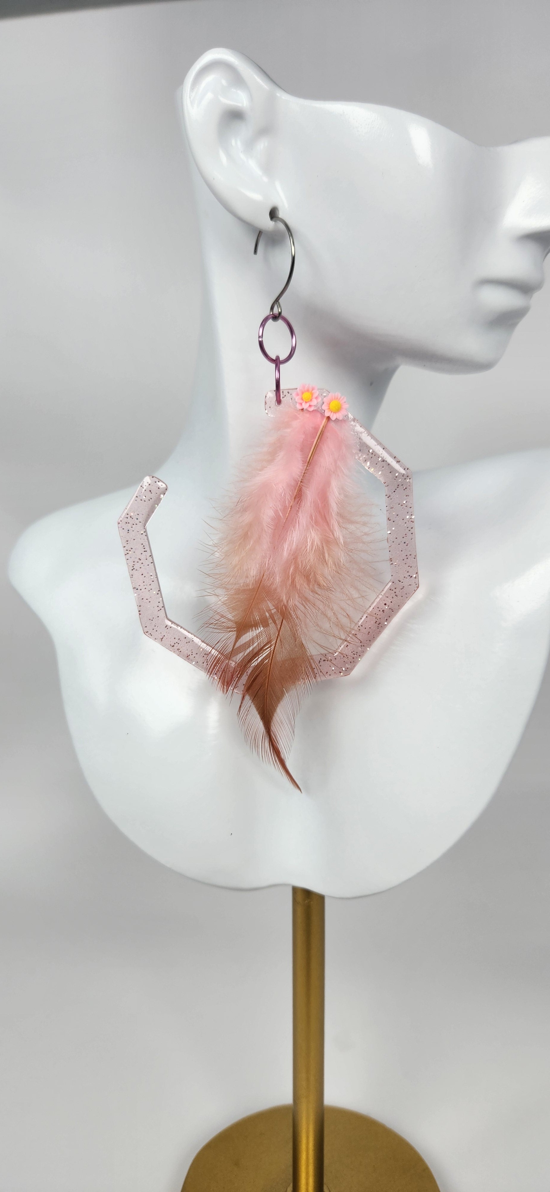 Pretty Pink Resin Glitter Hoop Earrings with Pink Faux Feathers