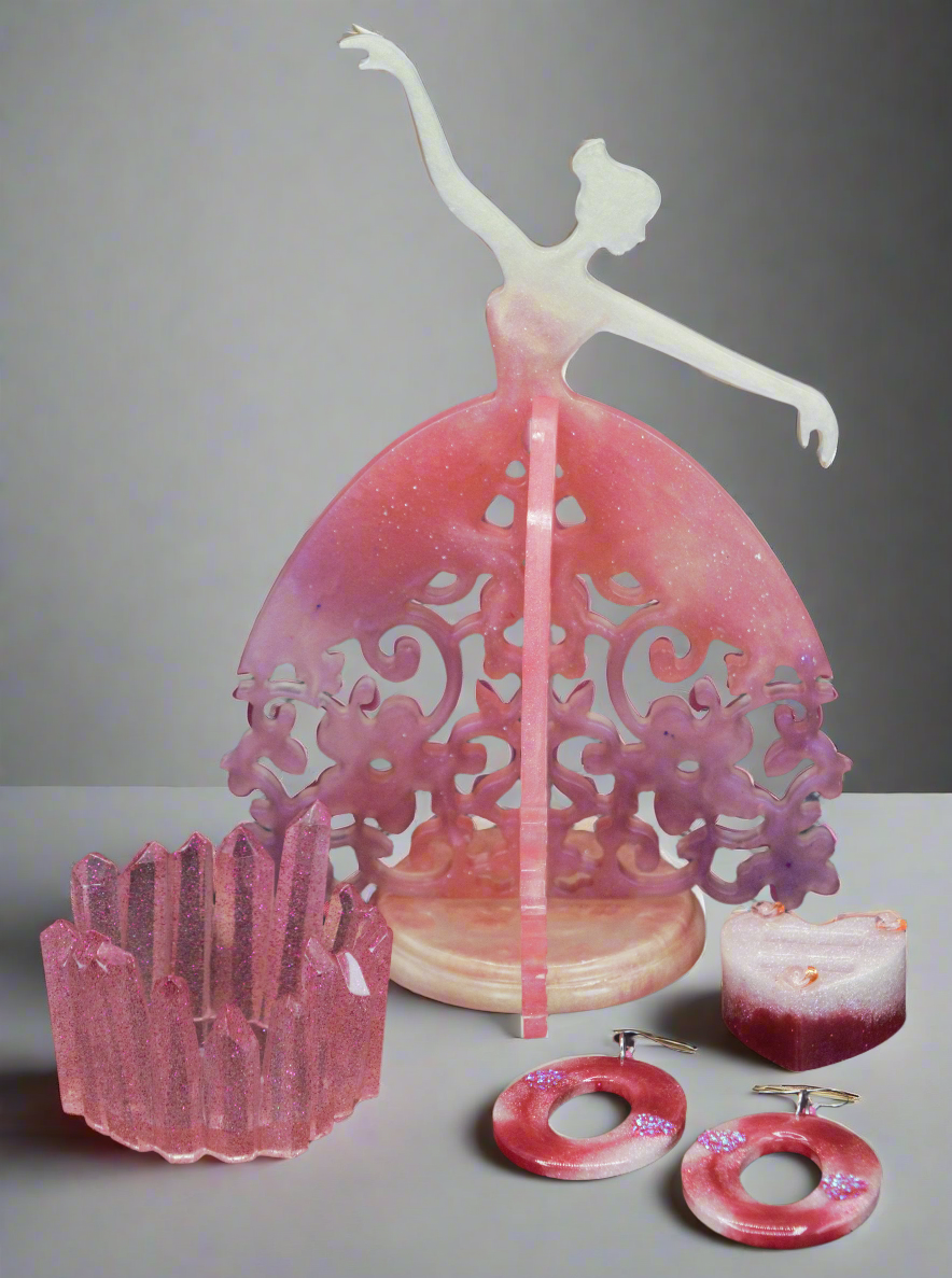 This display stand set is made 100% from resin. Its the perfect gift for any girly girl who adores pink Princesses and is learning to properly care for jewelry. It comes with a pair of oval pink and white resin earrings, adorned with 2 small glittery heart charms. The earrings have hypoallergenic stainless steel hooks. Also included is a pink and white glitter resin ring holder and a pink glitter resin jewelry dish, resembling crystal.