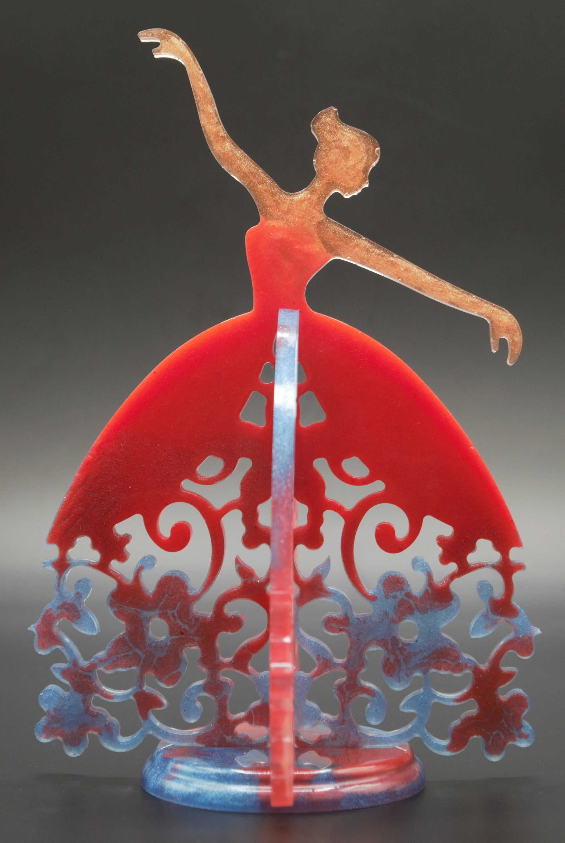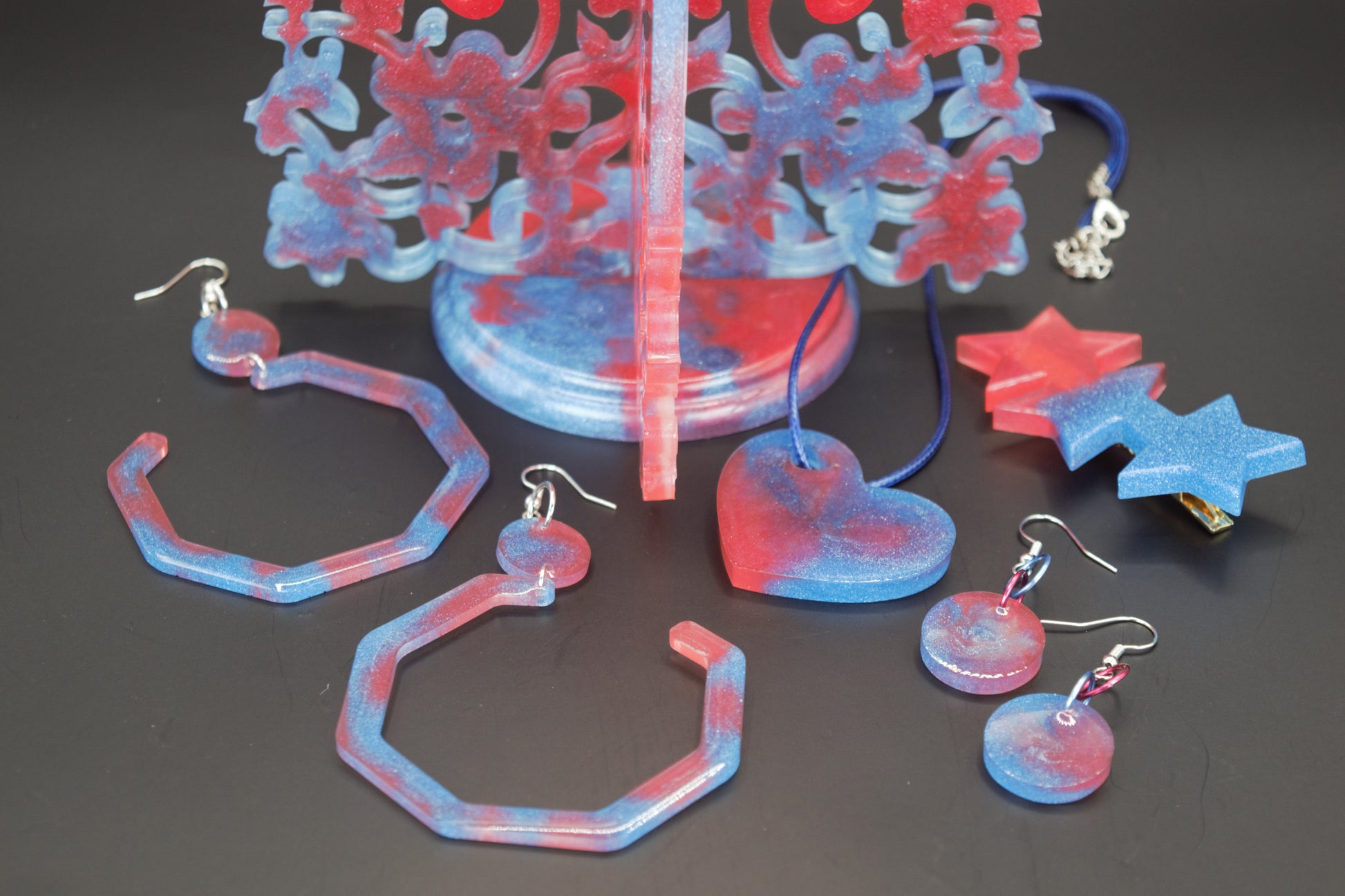 This display stand set is made 100% from resin. It was created for any girl or woman with a fiery red hot side to her personality with swirls of blue. It comes with two pairs of resin earrings that have hypoallergenic stainless steel hooks. First pair are small circles with swirls of red and blue. Second pair is a lightweight red and blue hoop attached to a small circular piece connected by a stainless steel ring. It also includes a heart shaped necklace with a blue wax chain, red and blue star hair clip that's attached to a steel alligator clip with teeth.