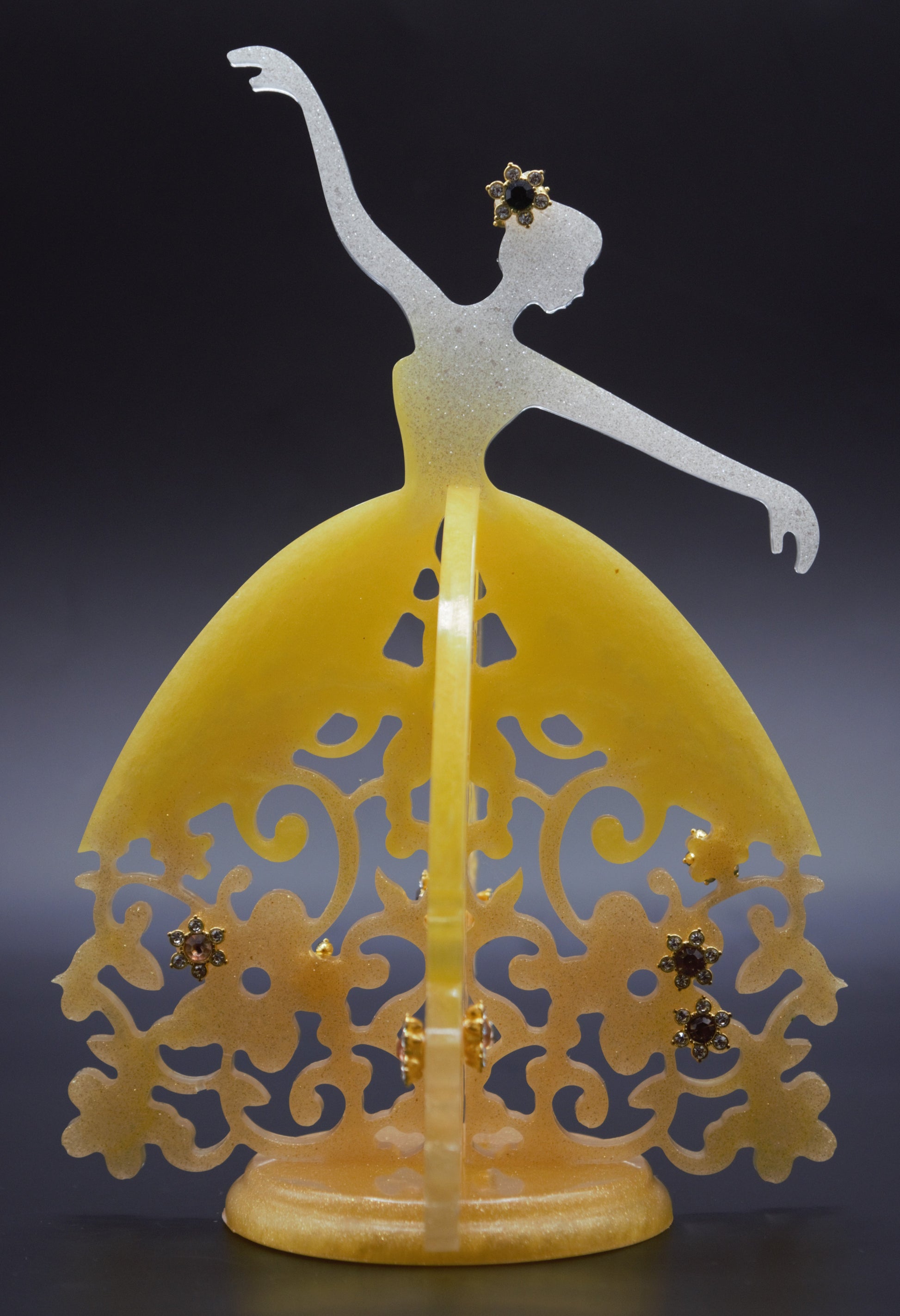 This display stand is made 100% from resin. I created this particular one with Belle, from Disney's Beauty and the Beast in mind. The yellow and white stand is decorated with gold and white flower charms randomly placed throughout to add a special touch of beauty. This is a nice item for any young girl who is in the learning phase of properly caring for her jewelry.