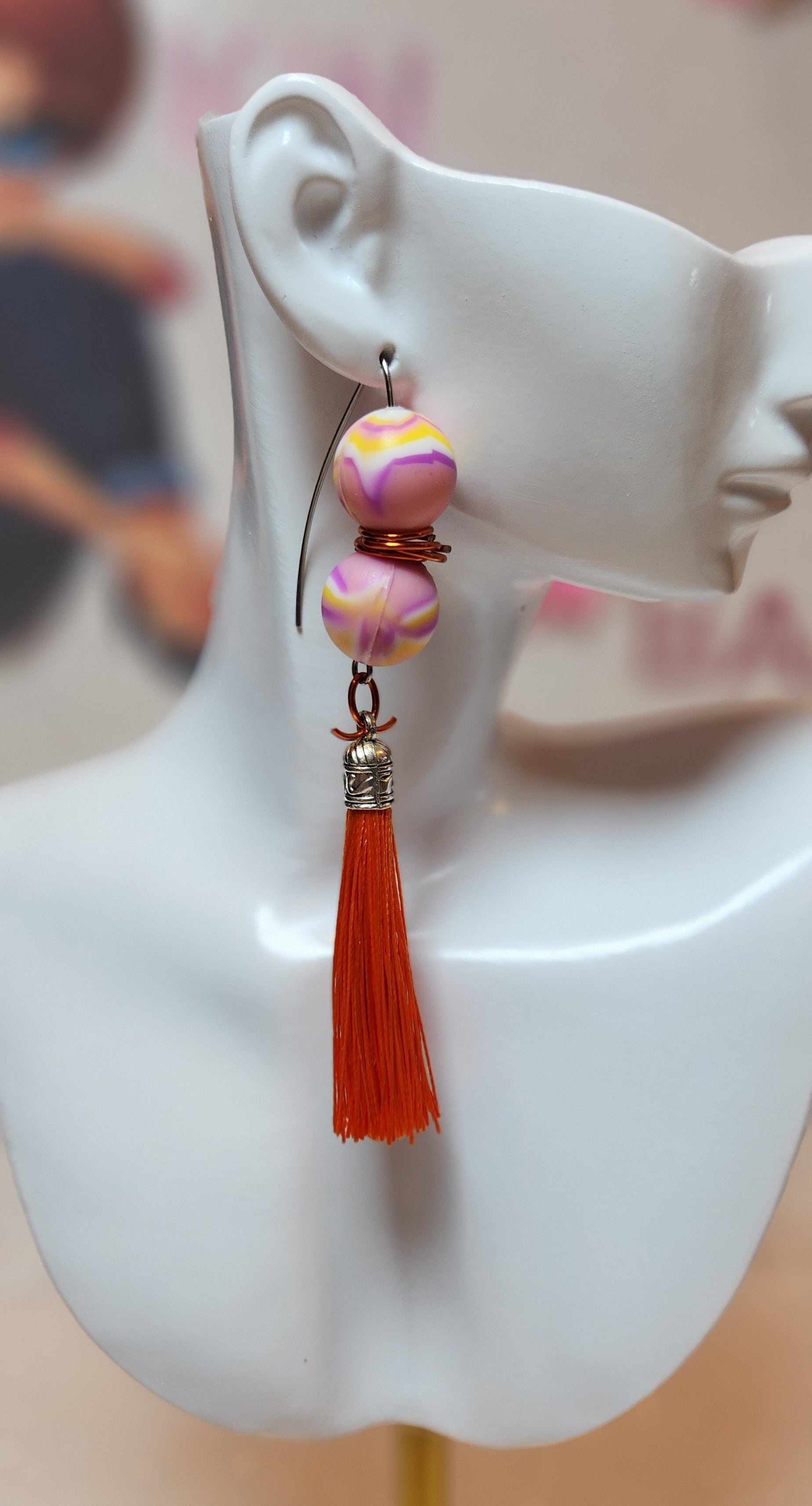 Handmade earrings with two rubber beads and aluminum jump ring spacers hanging from a V-shaped Marquise stainless steel hook with bright orange tassels.