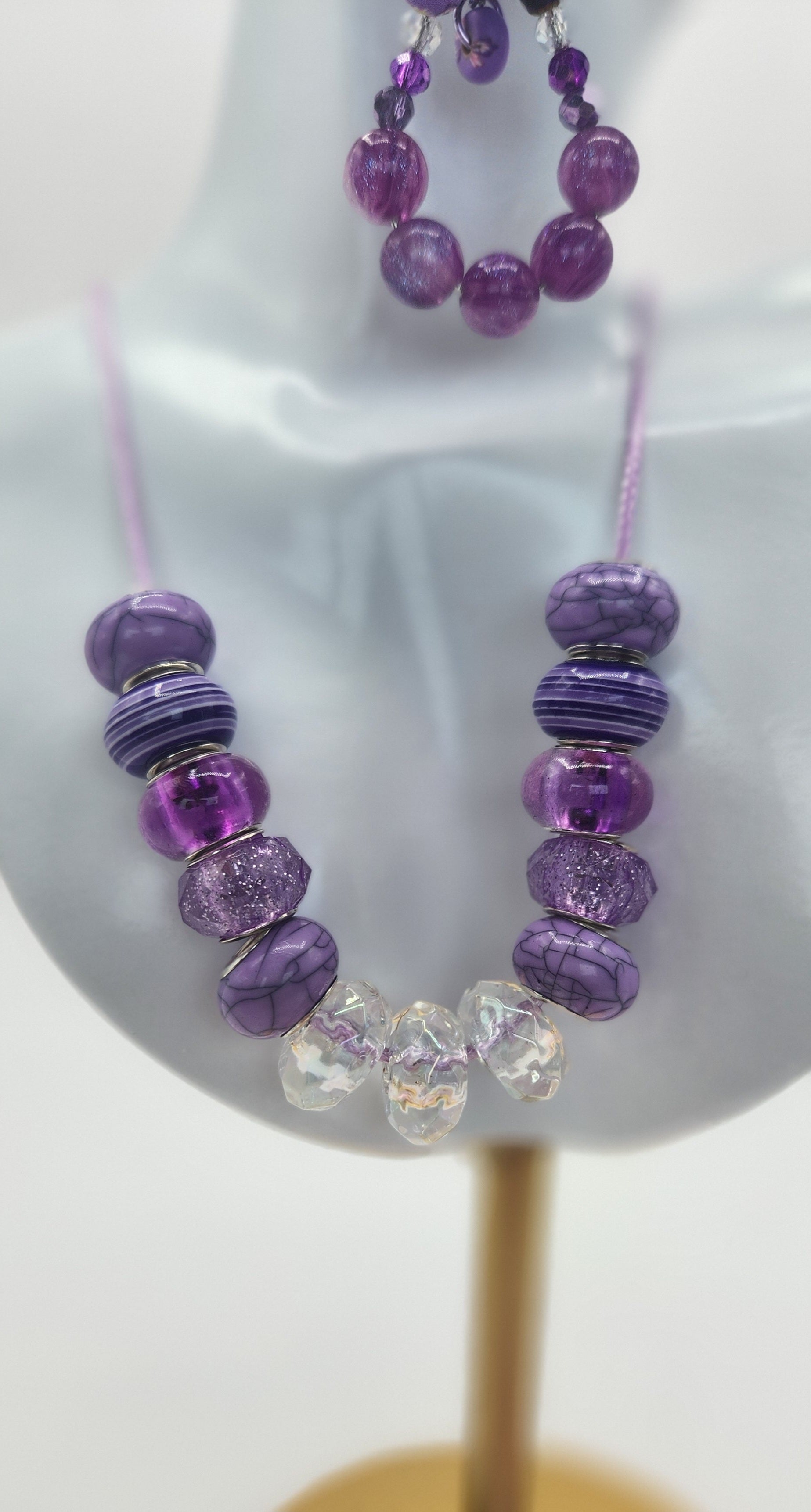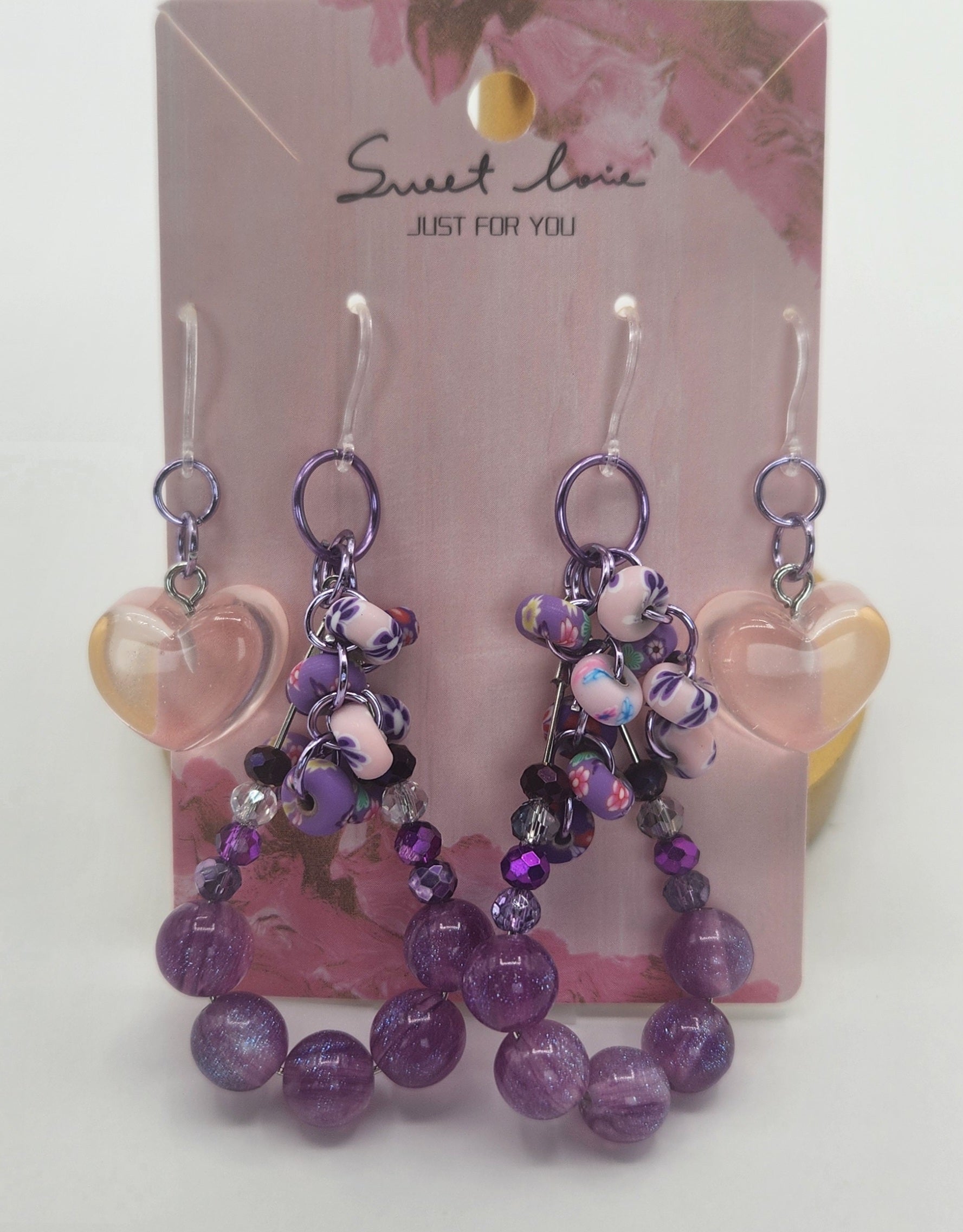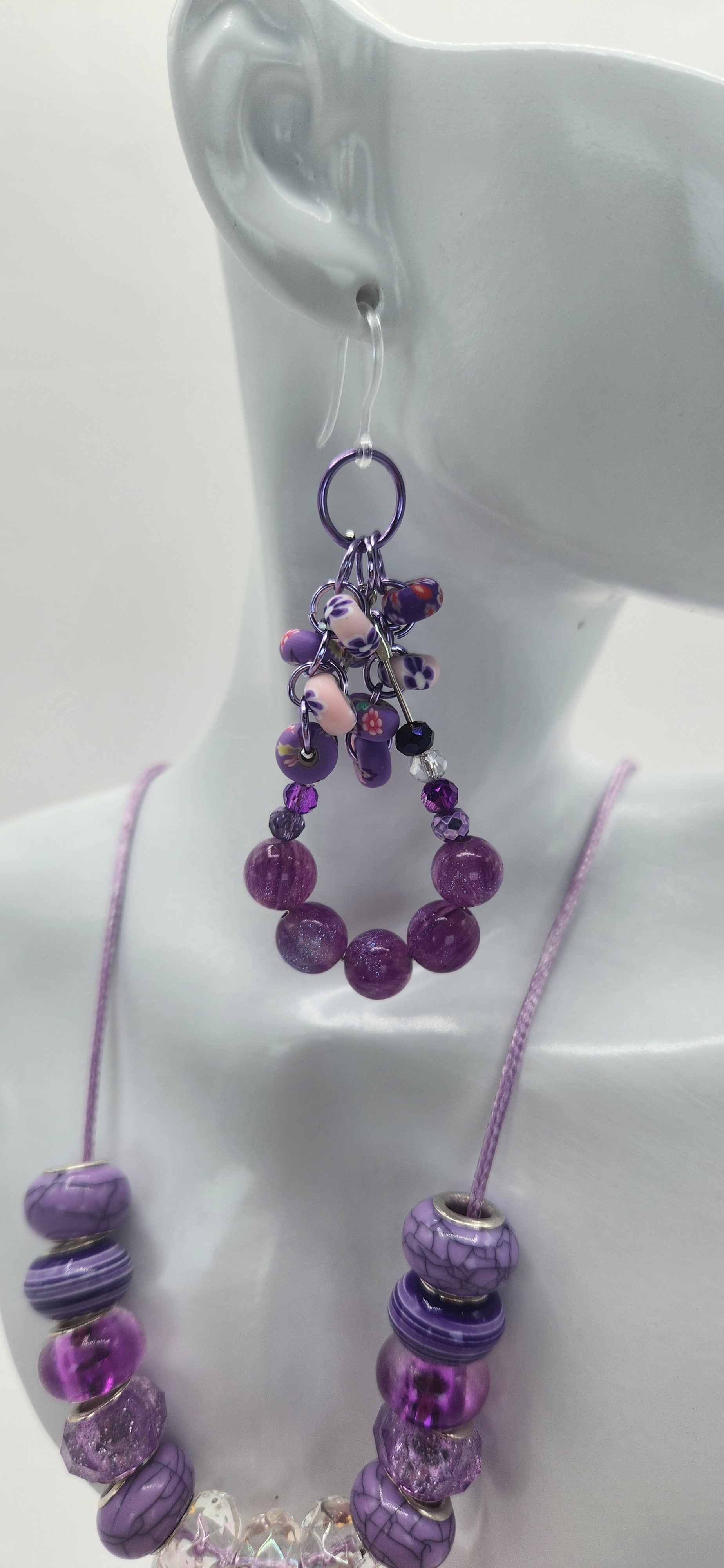 This dazzling purple pizzazz handmade jewelry set is sooo full of purple-goodness with two pairs of earrings and one matching necklace. Shiny glass purple and clear beads on a cotton wax cord necklace with one pair of multi-layered beads on a wired teardrop frame, and a second pair of pink resin heart-shaped earrings. Both sets of earrings hang from a clear silicone earring hook and is well suited for those with sensitive skin.