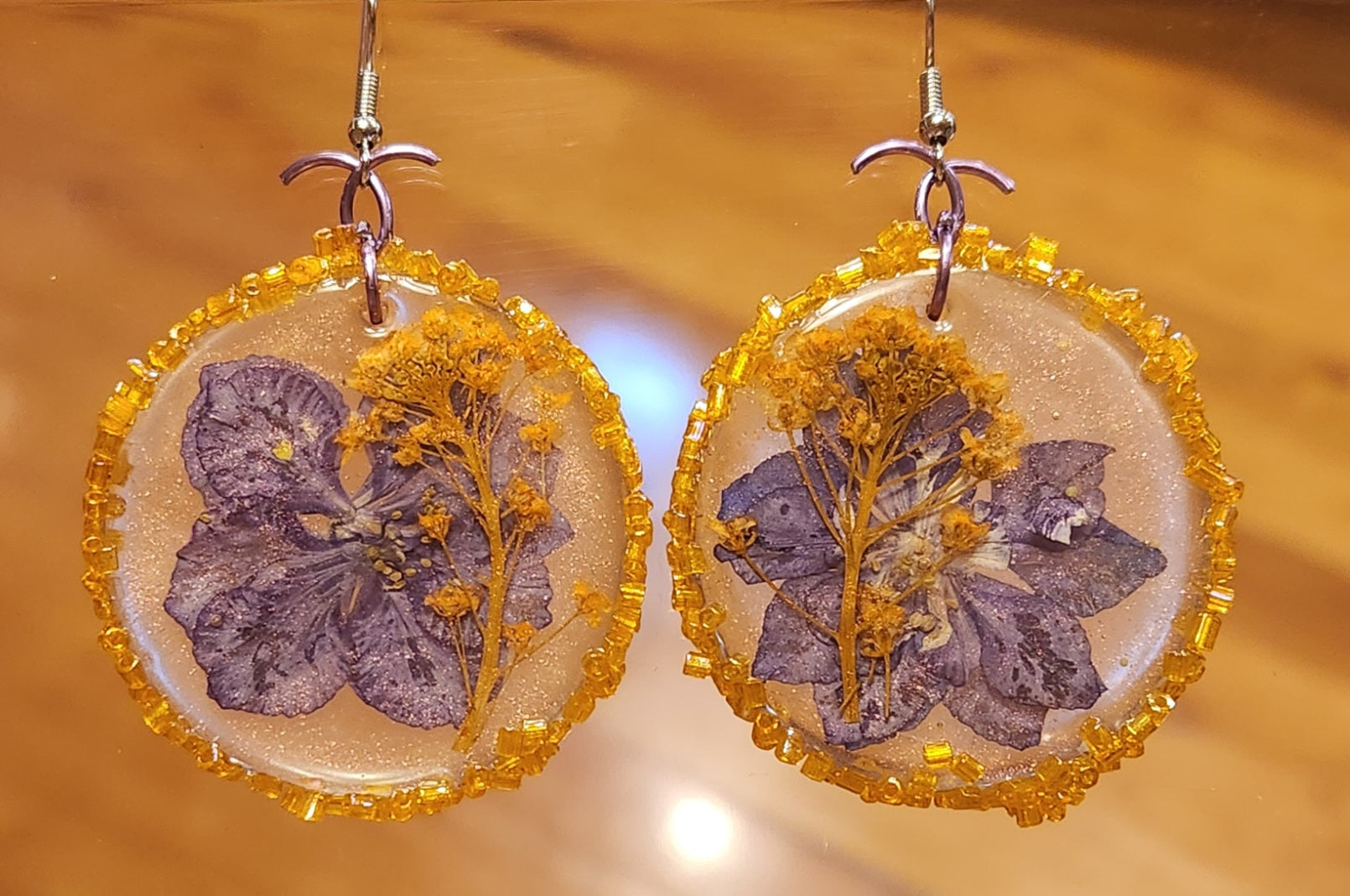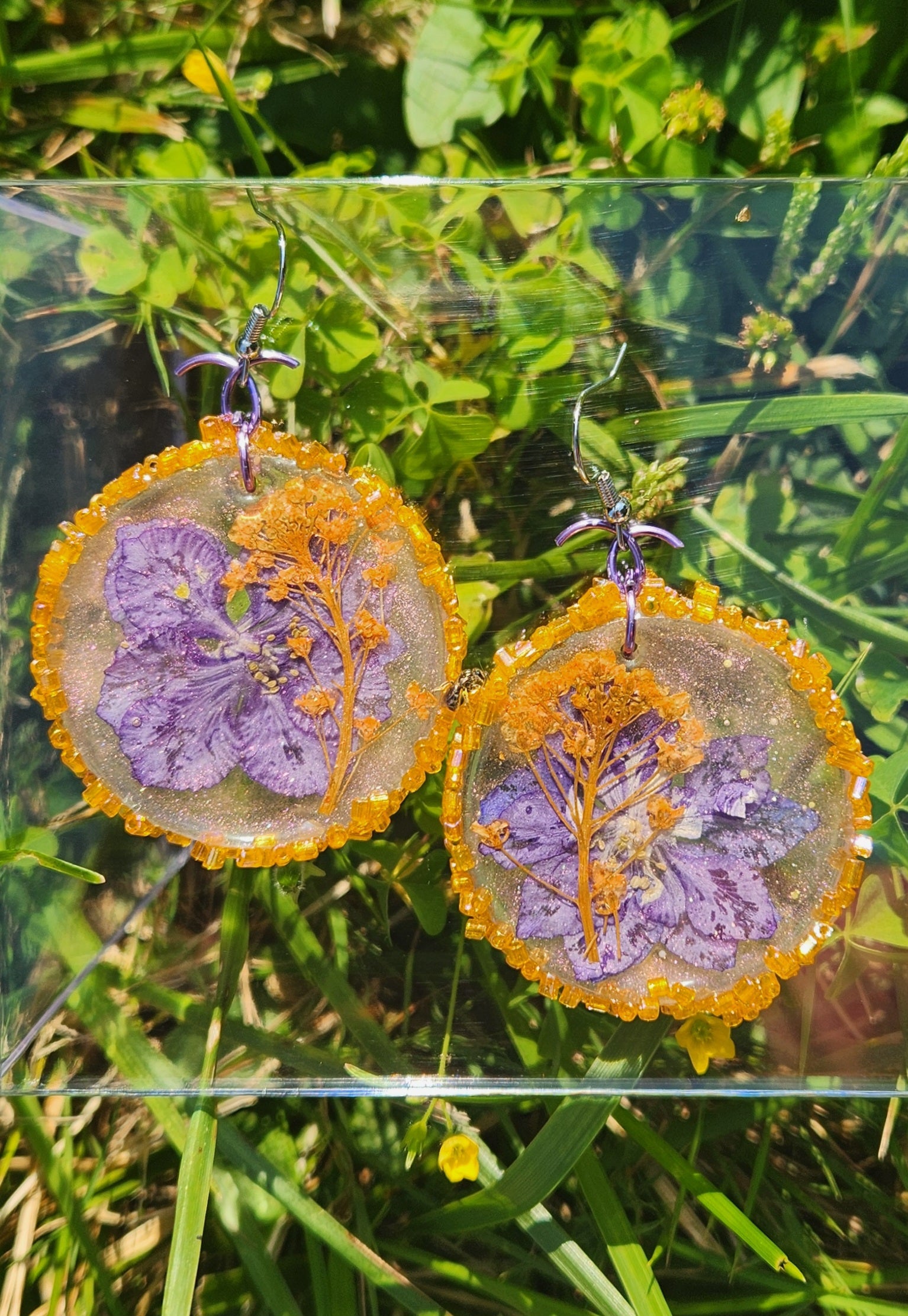 These purple and orange preserved flowers coated with resin and delicately placed inside the resin earrings with tiny orange beads layered around the edges are stunning, and these pictures don't do it justice! They are a must have for your jewelry collection! They hang from a stainless steel hook and are hypoallergenic.