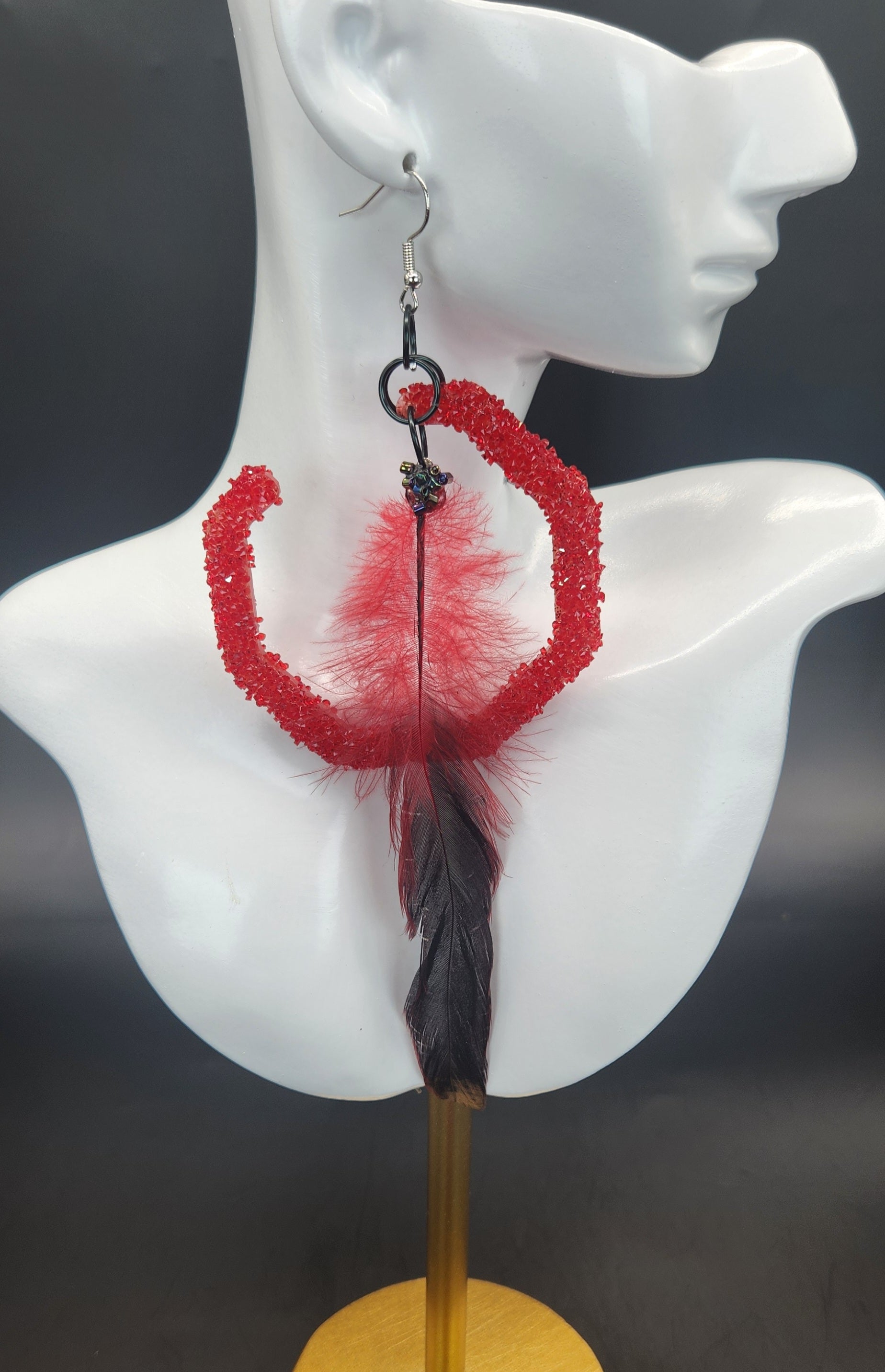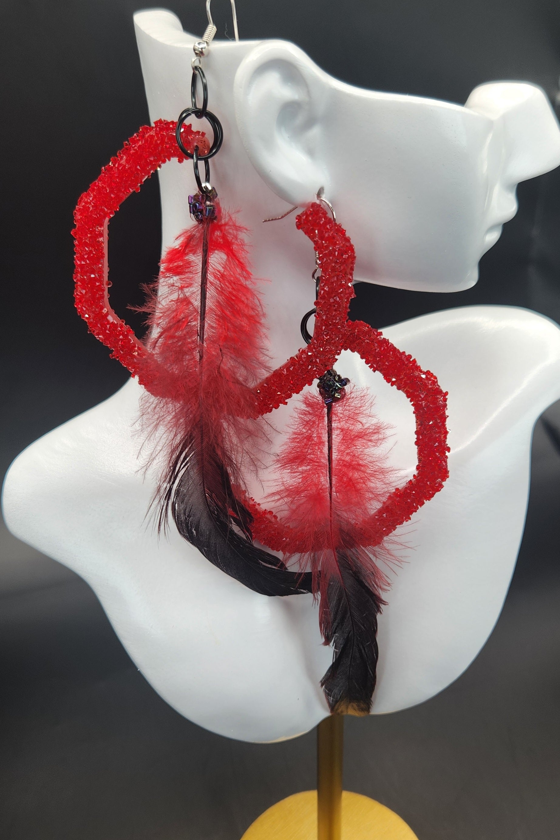 These daring handcrafted red resin hoops with tiny red glass beads embellished on top with black and red faux feather earrings hanging from a stainless steel hook says love, passion, power and danger. I mean, come on! Who doesn't think red is inviting and alarming? These earrings will bring conversation to the table for sure, and you will look sexy no doubt! These lightweight earrings hang from a stainless steel hook and are hypoallergenic.