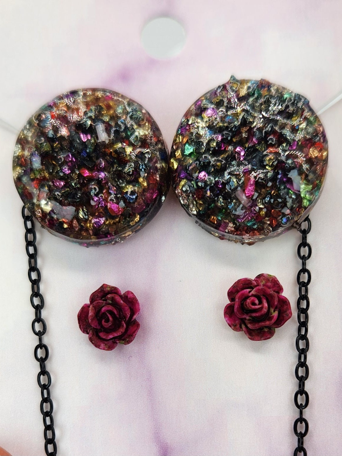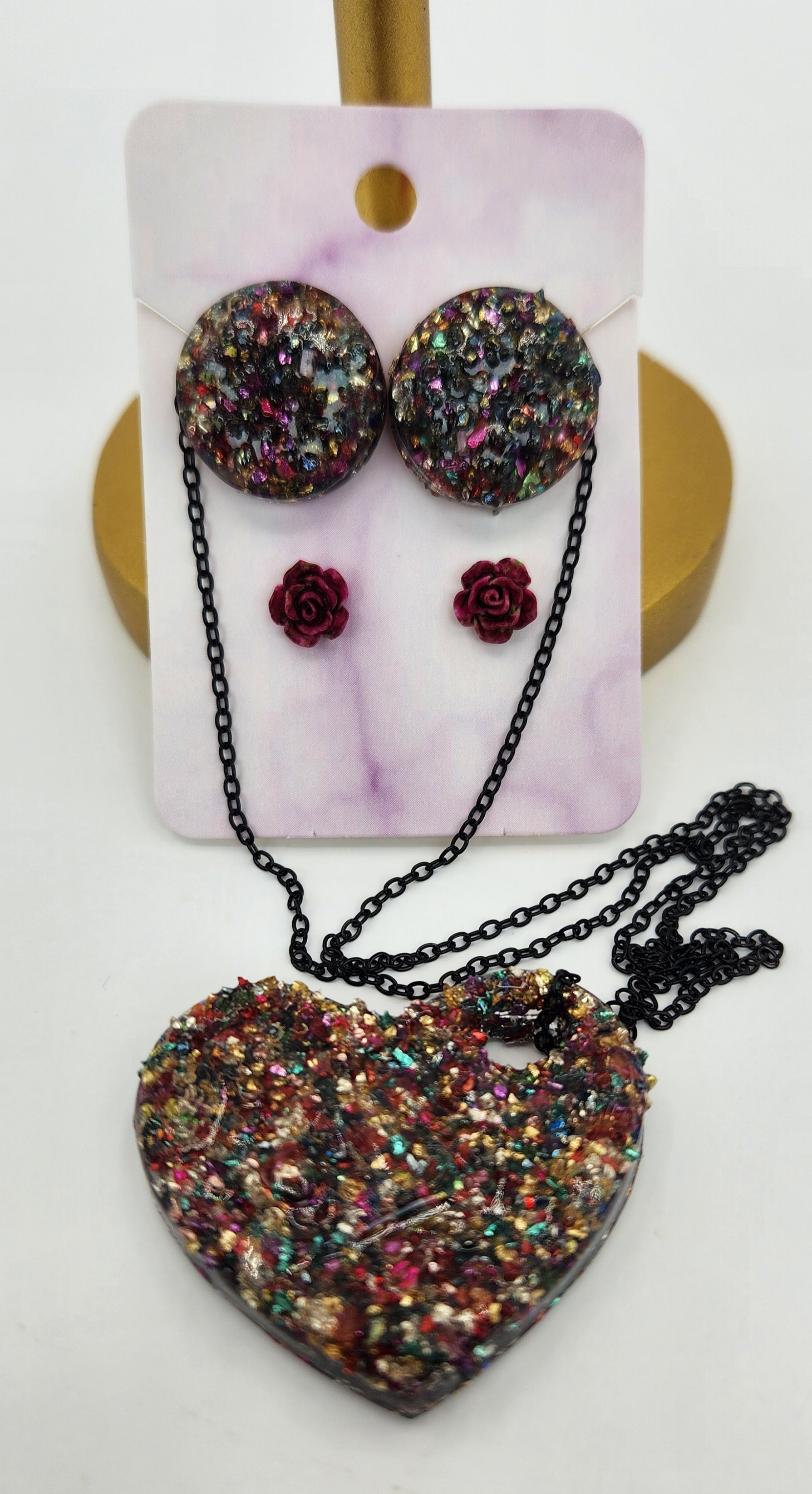 This handcrafted broken stone fashion jewelry set is full of colorful textured broken stones layered to give a 3-D attractive appearance. This jewelry set comes with two pairs of earrings. Both have stainless steel hooks/backs. The large glossy stone heart-shaped necklace hangs from a black chain that is hypoallergenic.