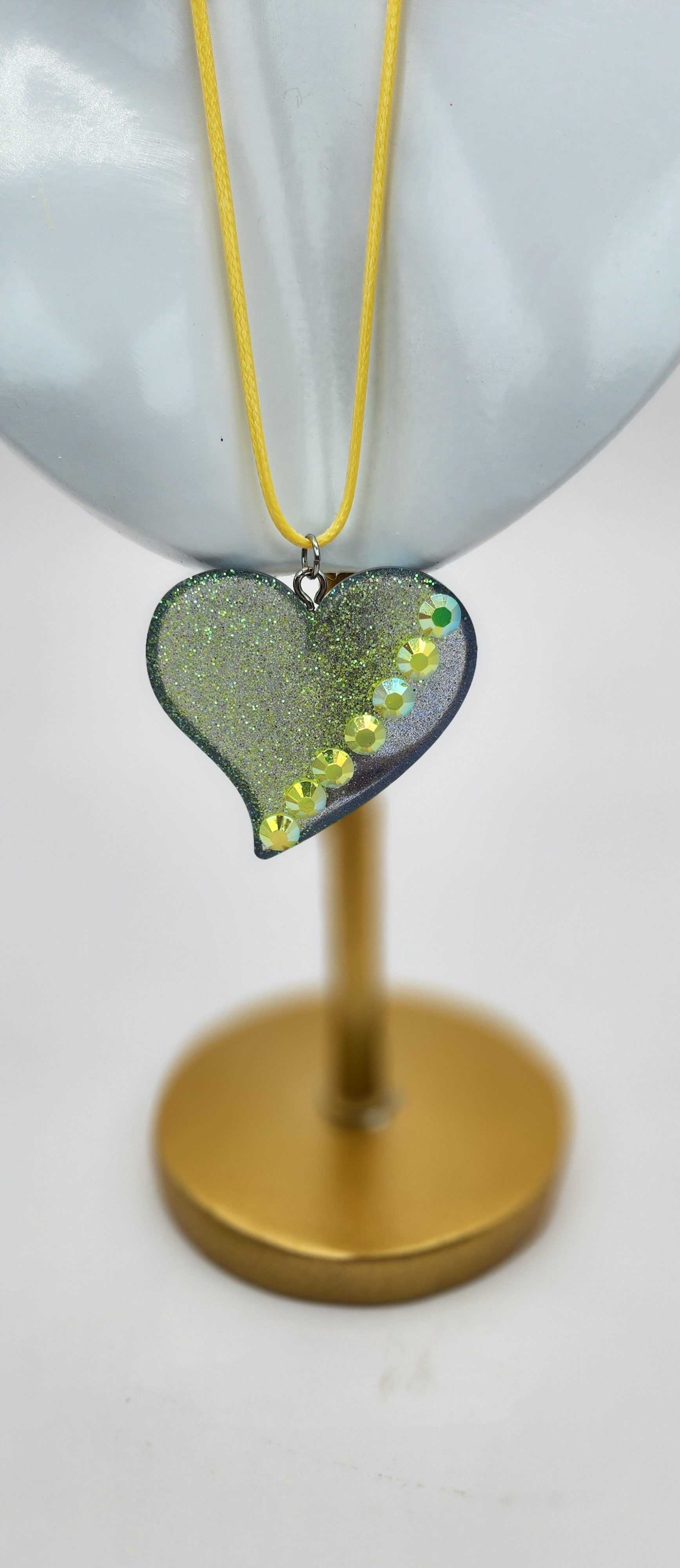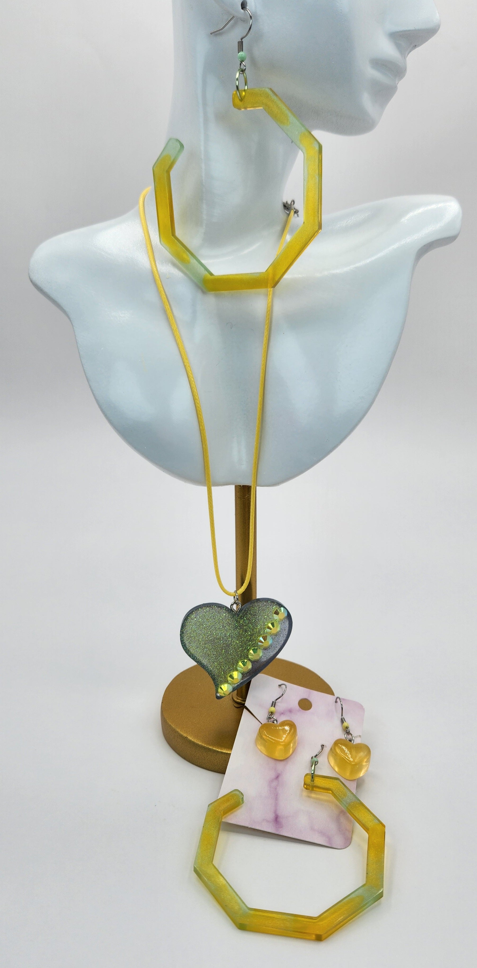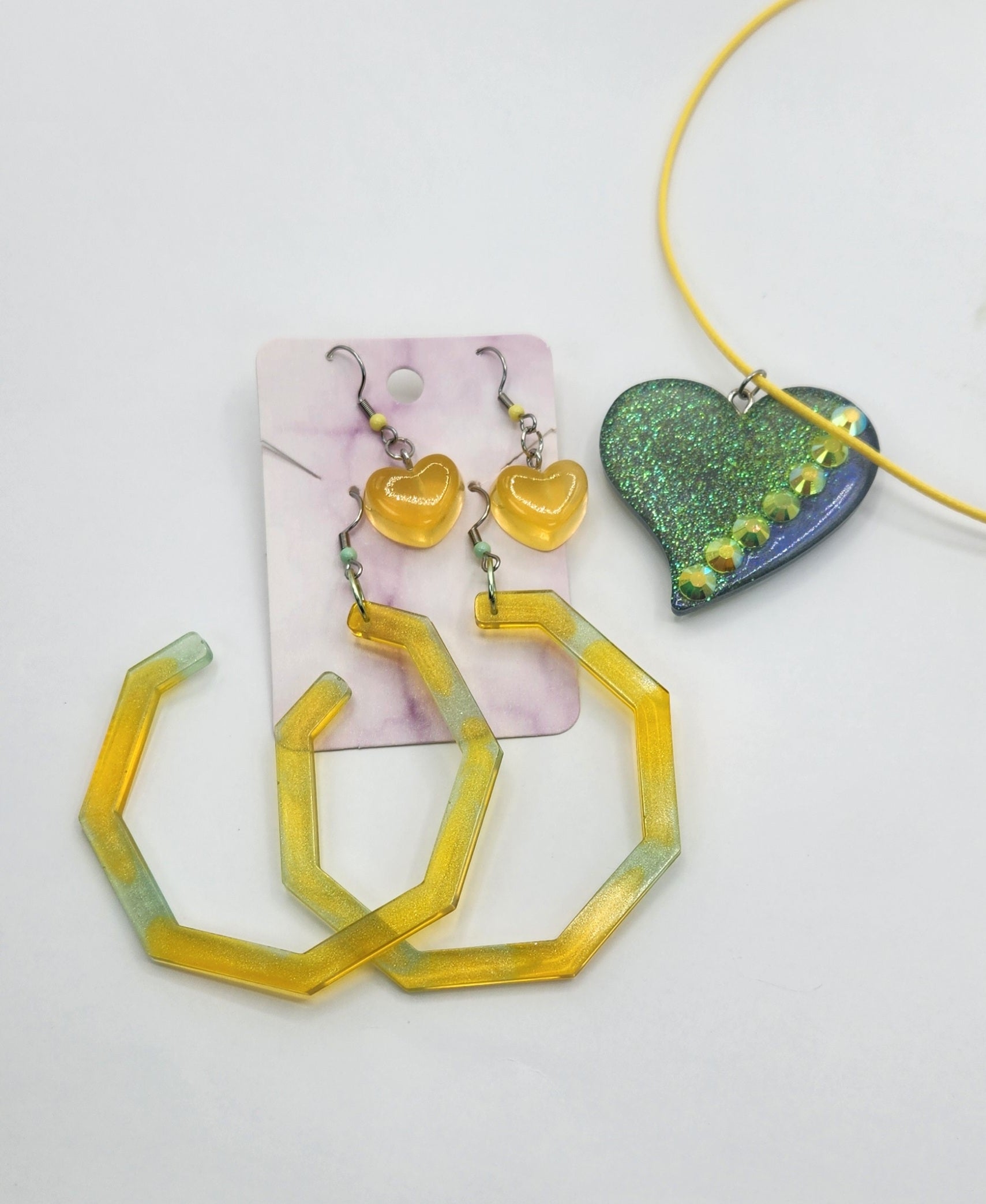 This bright fun handcrafted jewelry set is a remembrance of fun days in the sun! This beautiful set will definitely add some light and life to your mood and outfit. It comes with two pair of earrings and one necklace. Both earrings have stainless steel hooks and are hypoallergenic. The large sparkly heart pendant necklace hangs from a wax cord.