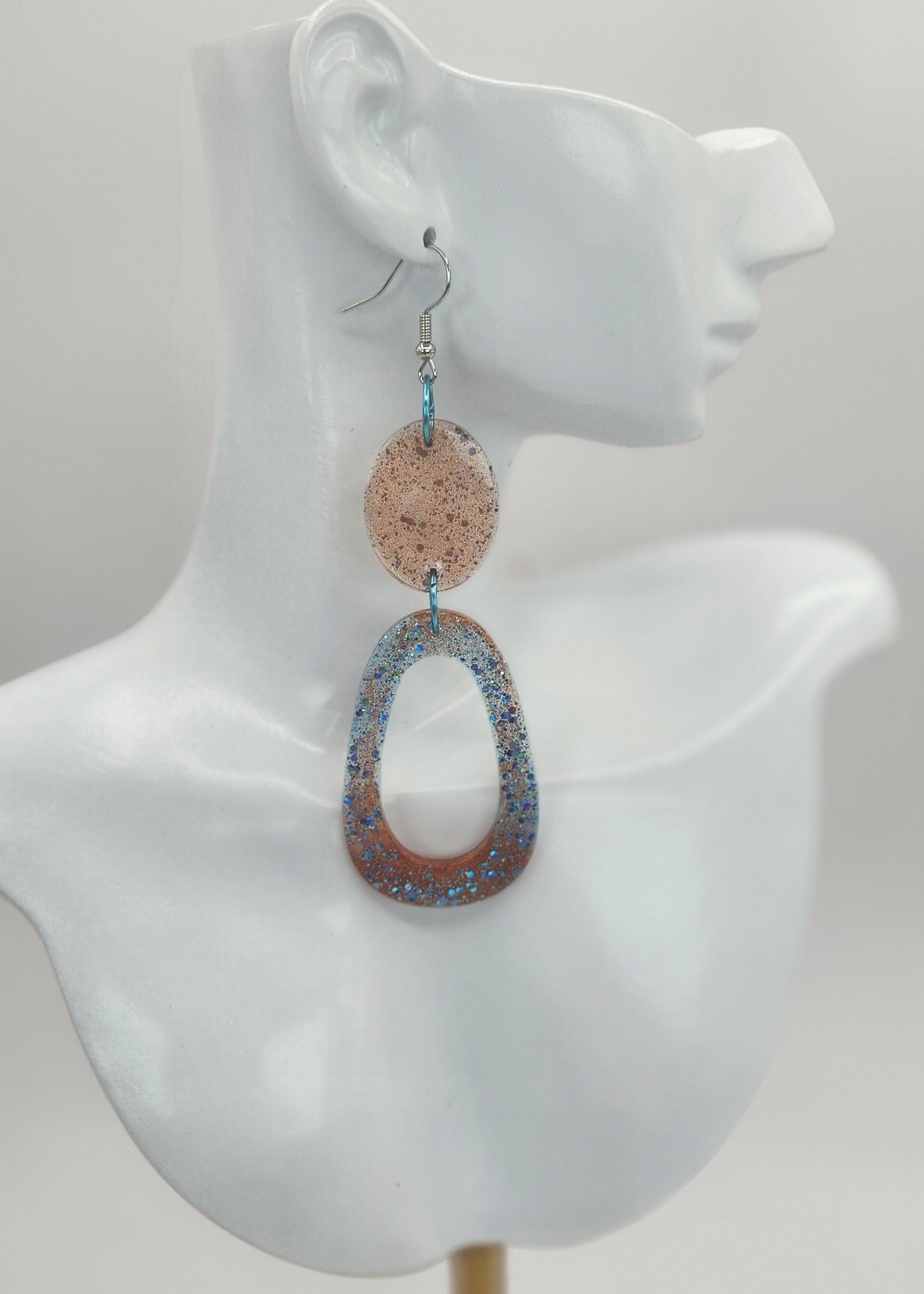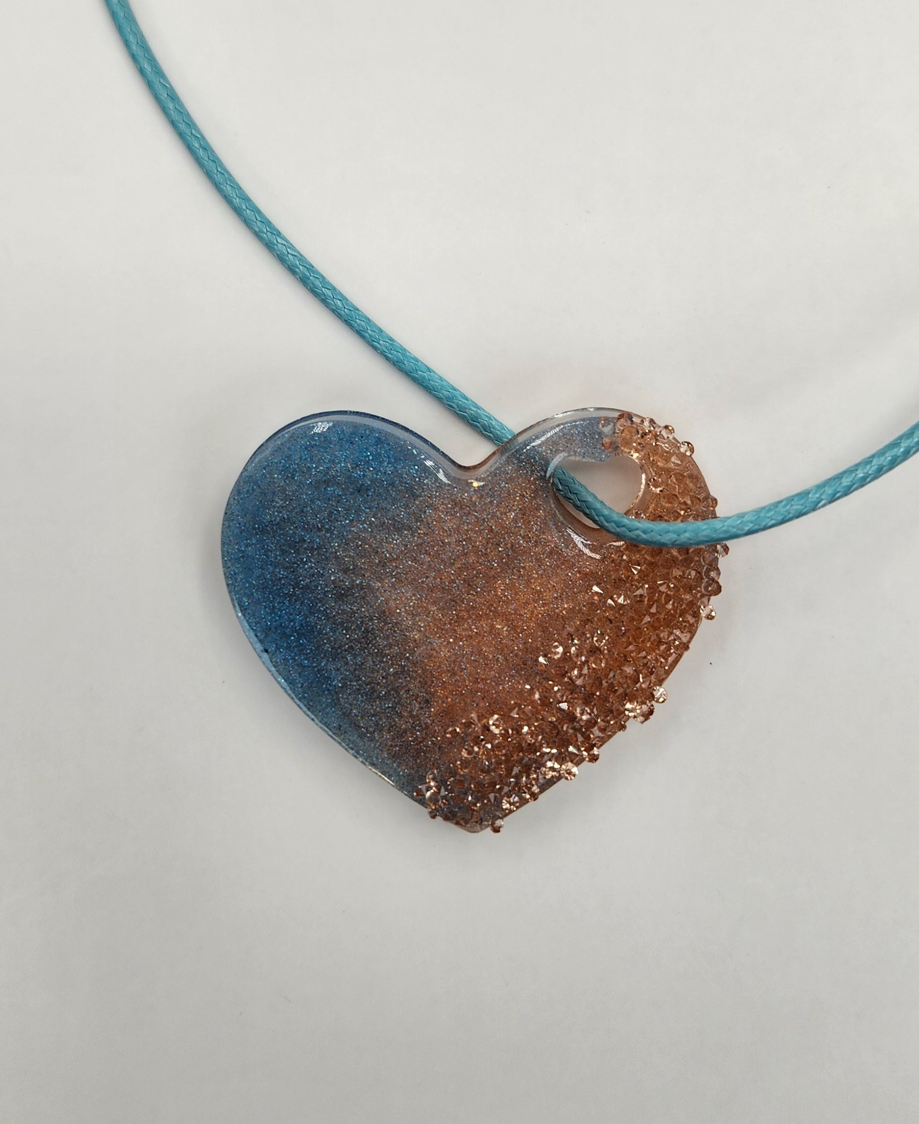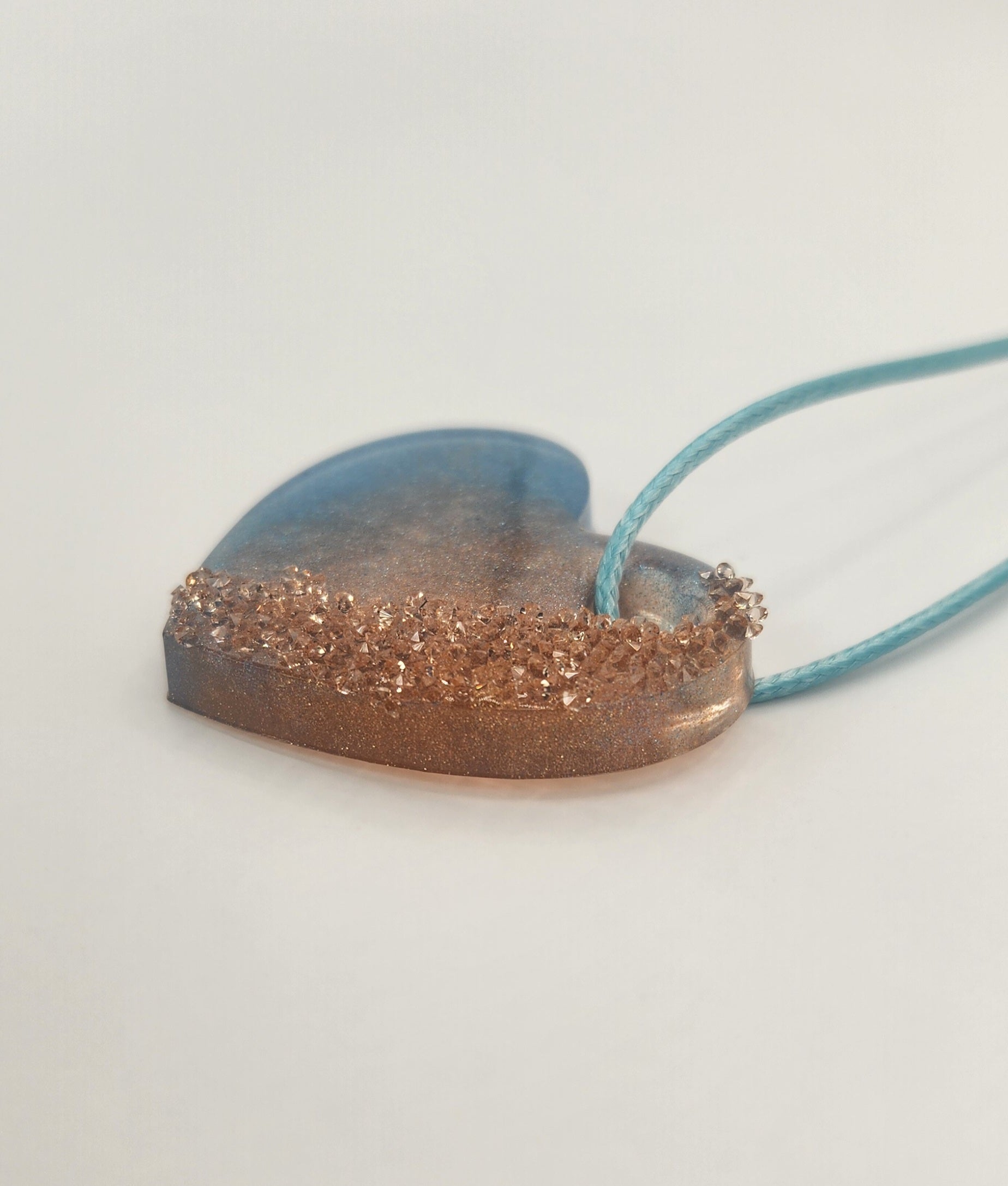 This sophisticated gold, amber, brown and blue glitter vintage handmade jewelry set will show everyone around you that playing dress up isn't just for girls! This fun accessory set will leave you wanting more! It comes with two pairs of earrings and one necklace. Both earrings dangle from stainless steel hooks and are hypoallergenic. The large glossy heart pendant necklace with speckles of glass beads on one side, hangs from a wax cord and falls in perfect eye view to be admired!