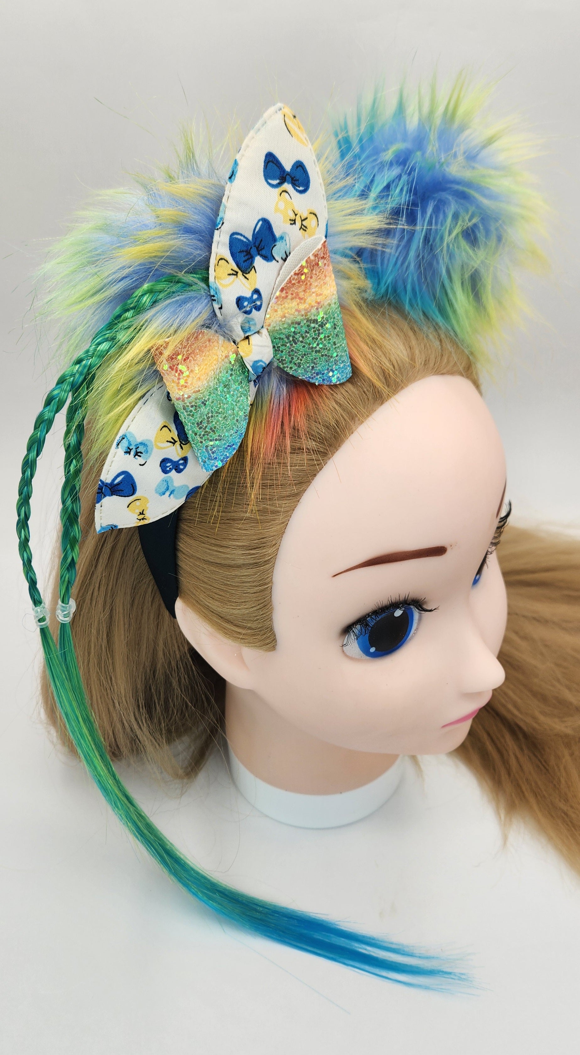 The NEW sassy is now furry!! This totally fun handcrafted wild pom-poms headband with a cutsie double bow with artificial braided hair is waayyyyy cool!!! This headband will have all the kids wanting wear one! *Hair is roughly 16inches long.