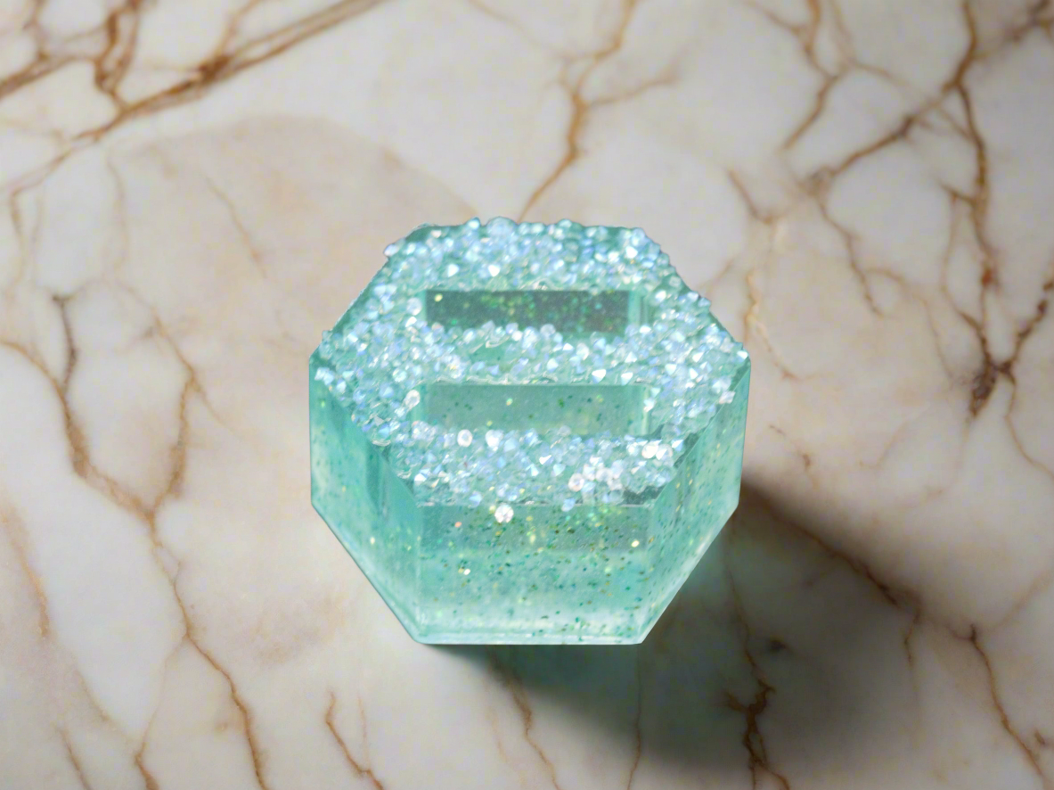 This shiney handcrafted pale blue glitter ring holder has clear glass beads scattered over the top for texture and decoration. Its perfect for someone who wants to prevent damages: scratches, bending, discoloration, or loss of their precious rings.