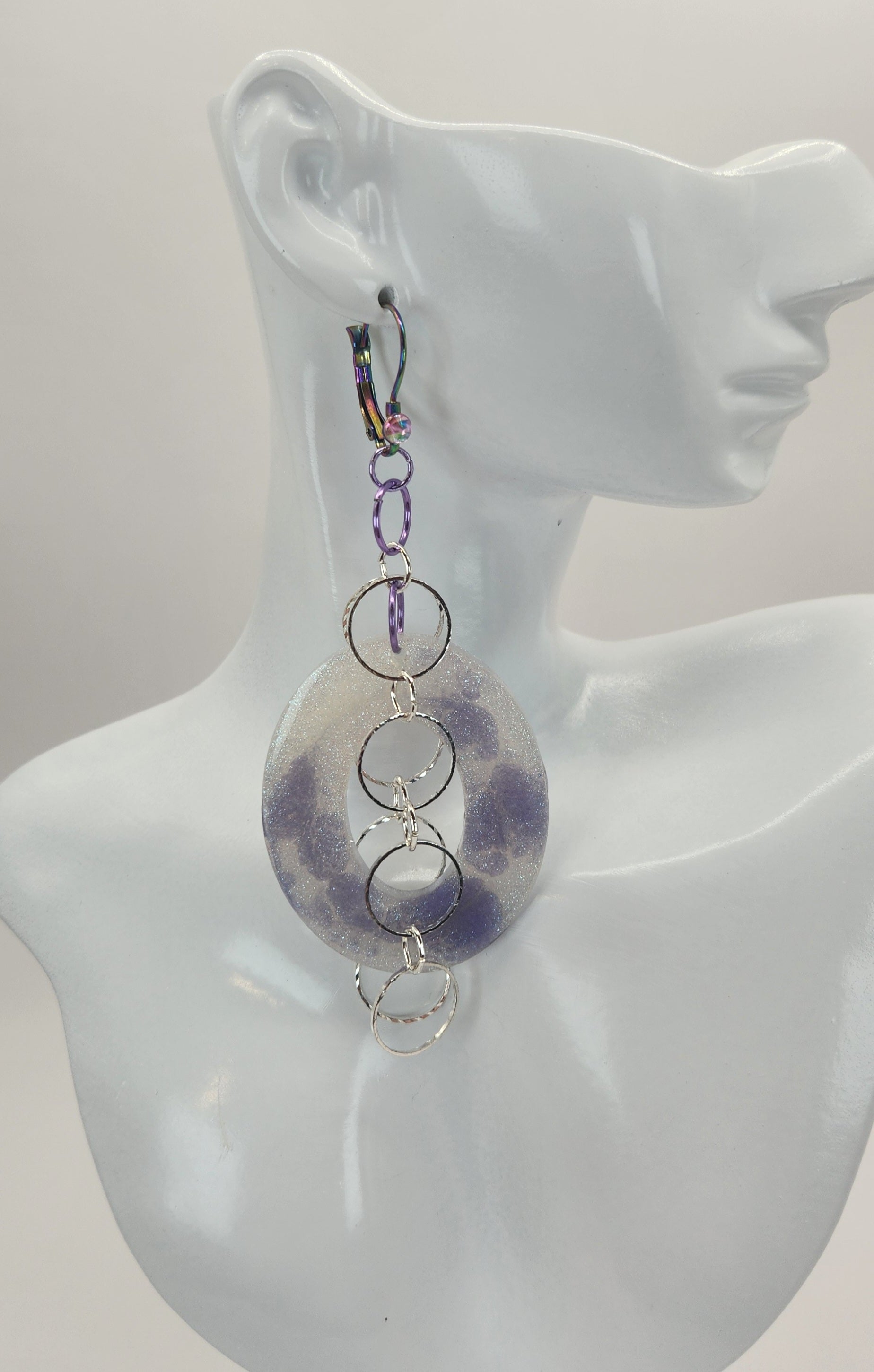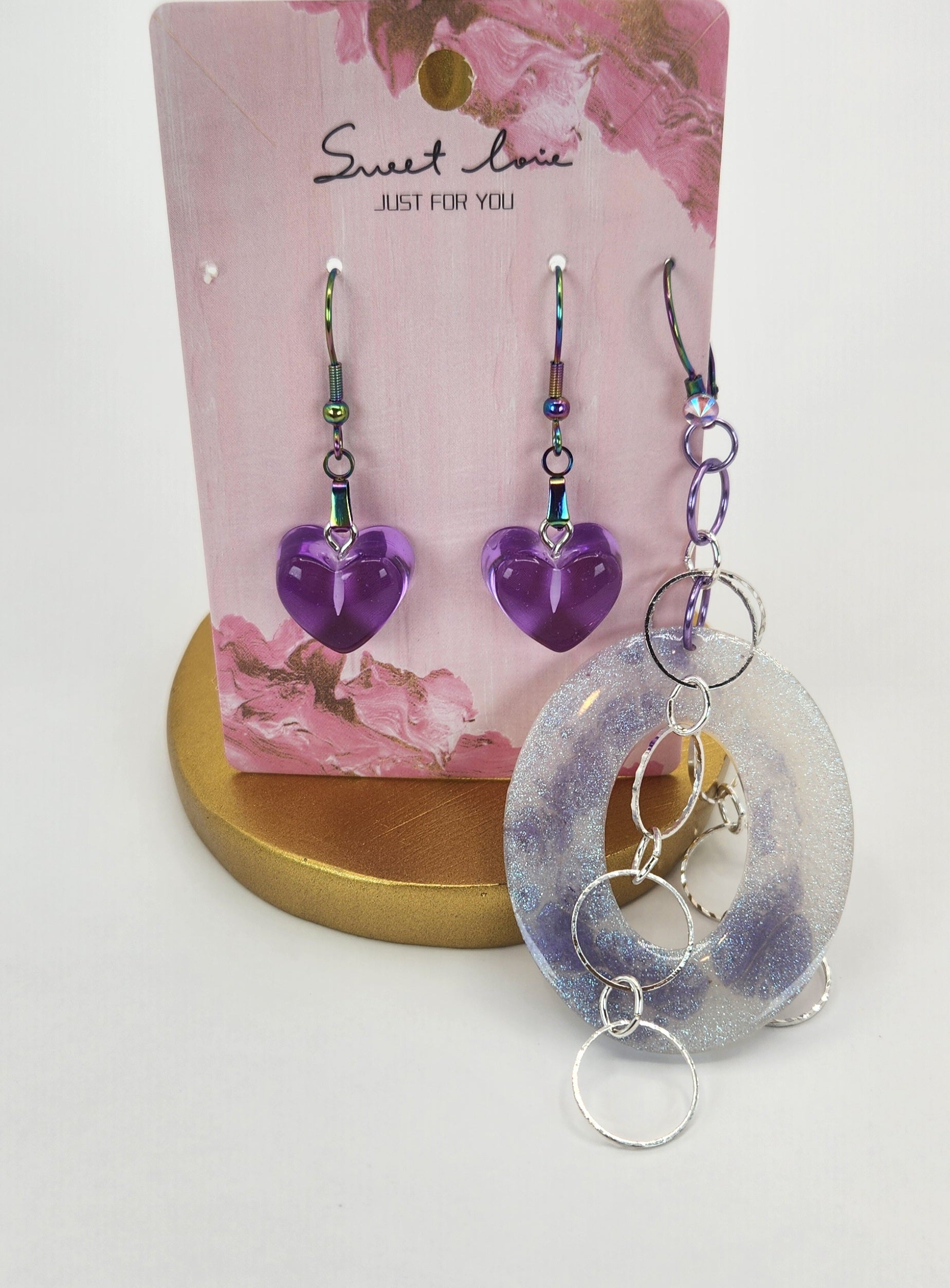 This spotted purple resin hoop earrings that hang along side a stainless steel mini hoop chain dangles from a rainbow leverback hook which has a hinged backing that snaps in place for security. The second pair of earrings are small purple resin hearts that dangle from a rainbow hook. Combine these two earrings together and you have stylish modern accessory art!