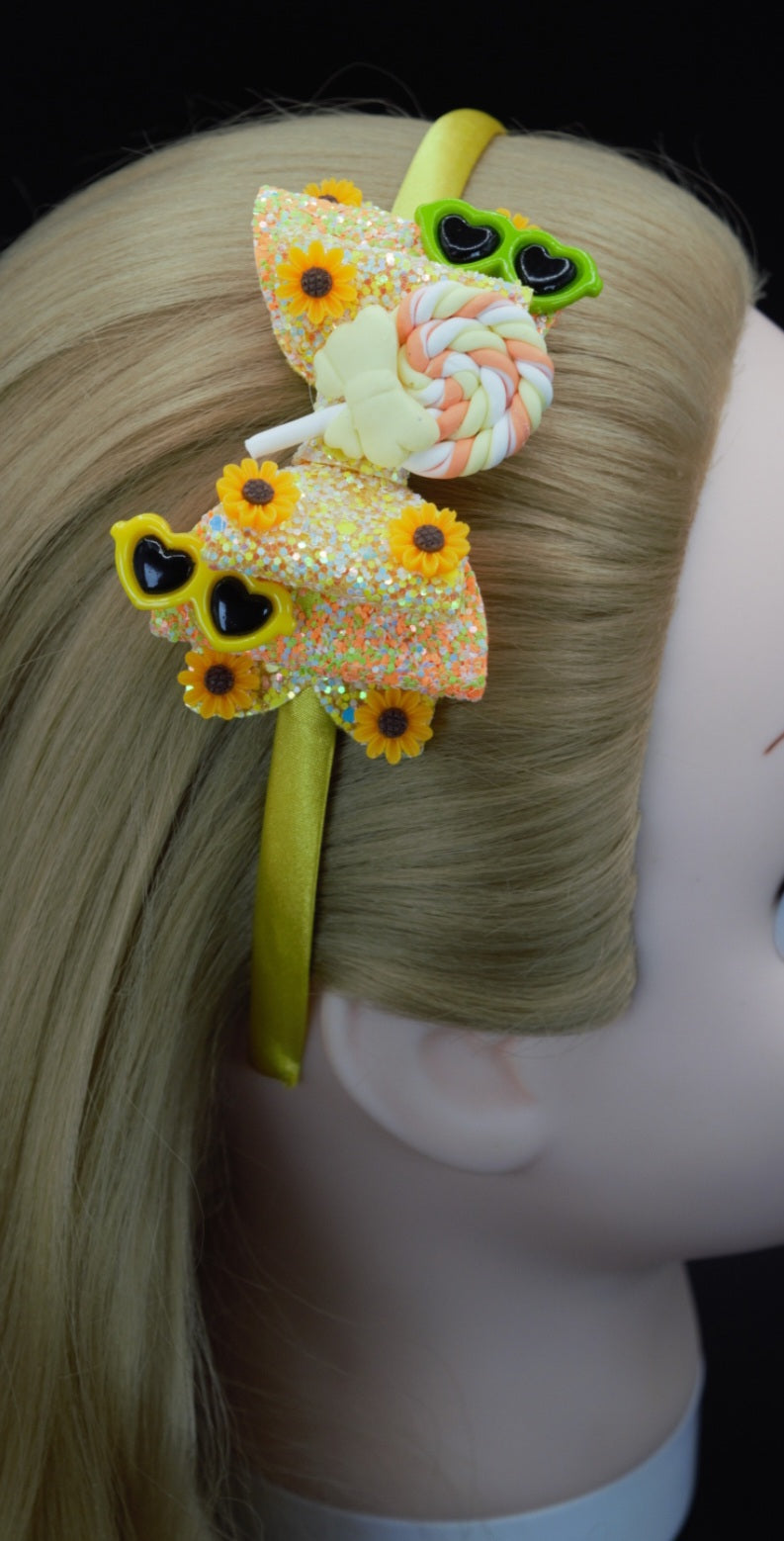 Fun... Sun... and Yum! Summer fun is about to get brighter and sweeter with this handcrafted yellow and green textured cloth hair bow with tiny dots, embellished with sunflowers, sunglasses and one lollipop swirl centerpiece!