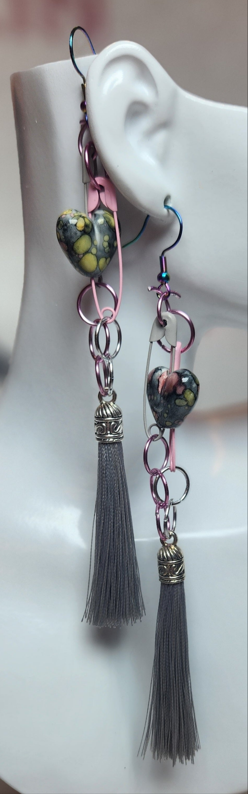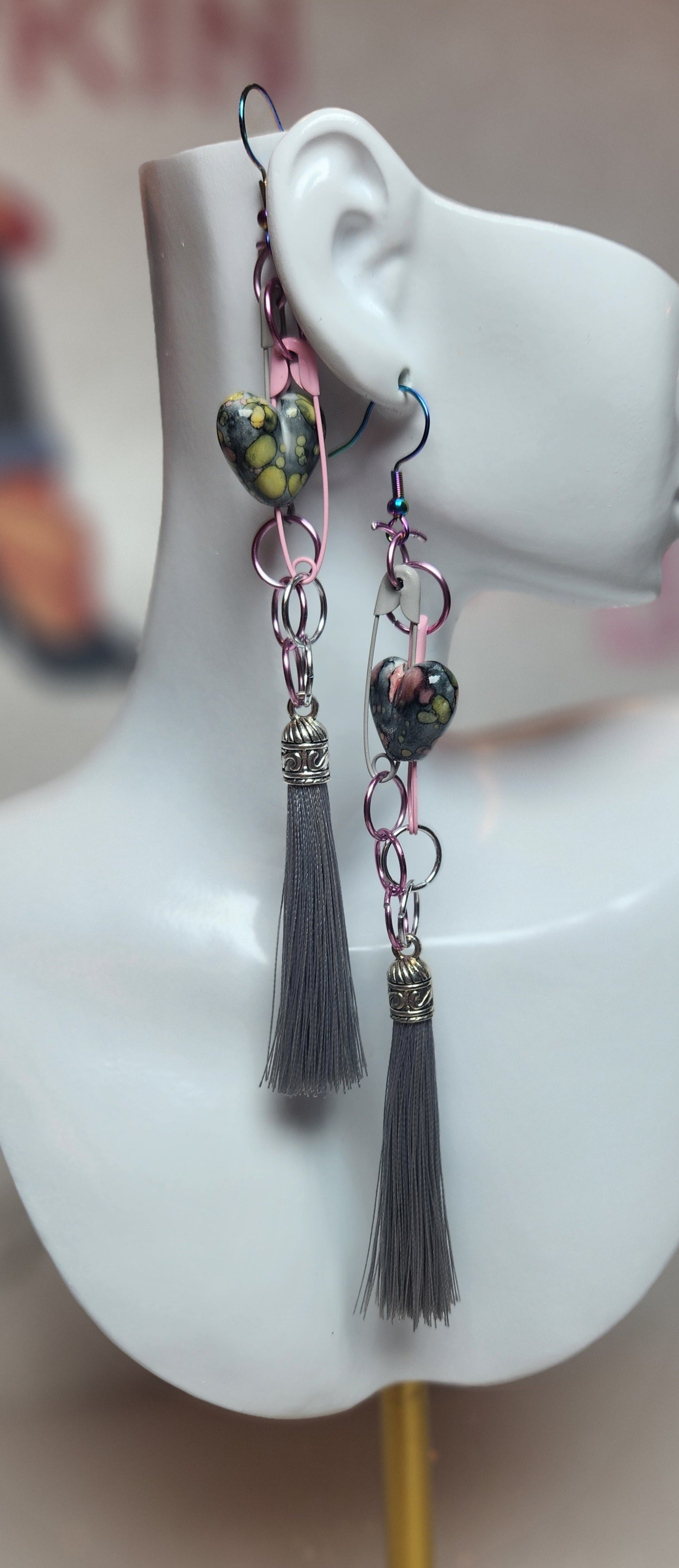Handcrafted spotted gray multicolored hearts thru a steel pin with aluminum jump rings hanging from a rainbow steel earring hook, and gray tassels dangling.