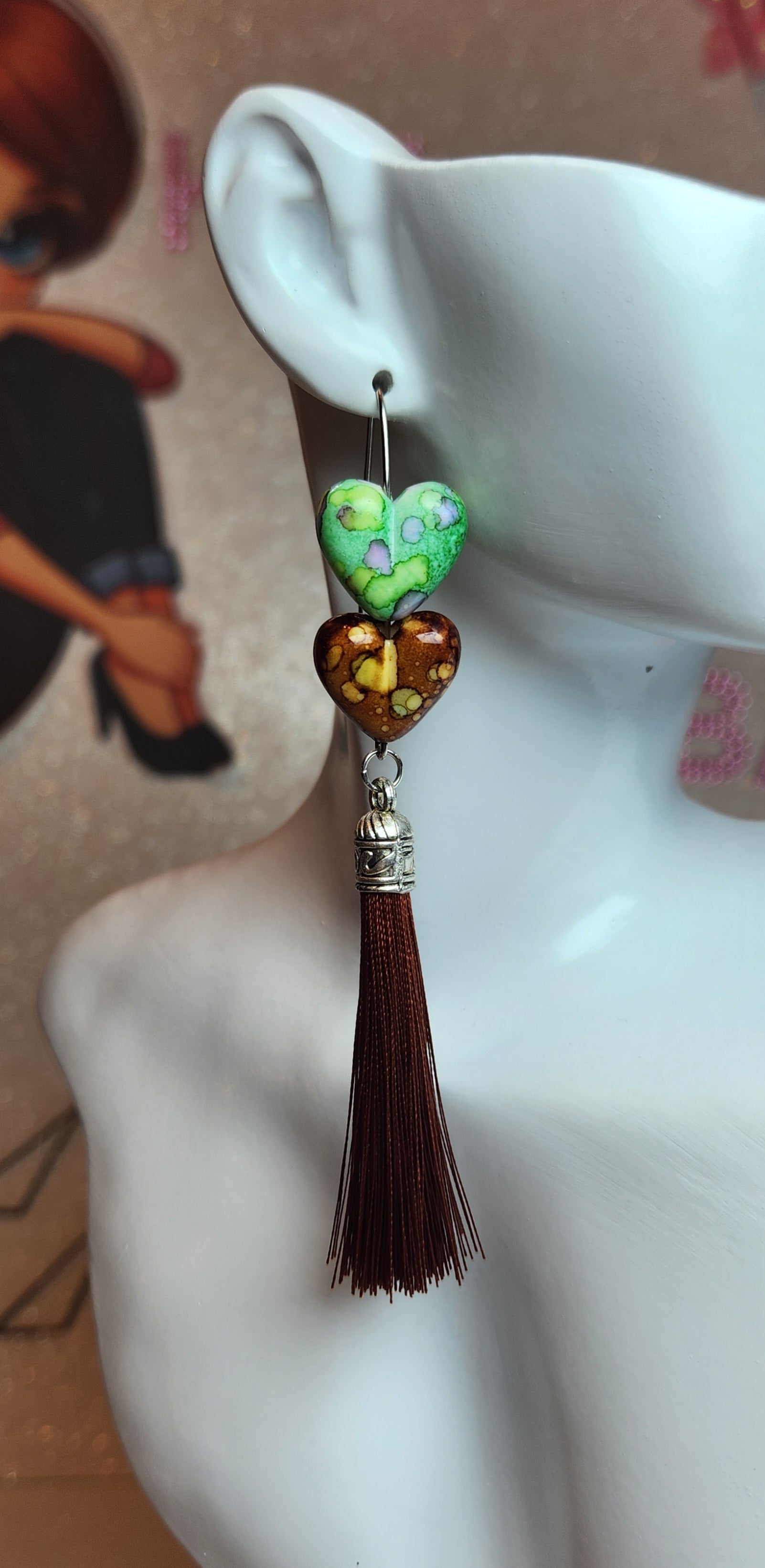 Handmade earrings with two hearts- one green, one brown with multi-colored spots and brown tassels hanging from a V-shape Marquise stainless stainless hook.