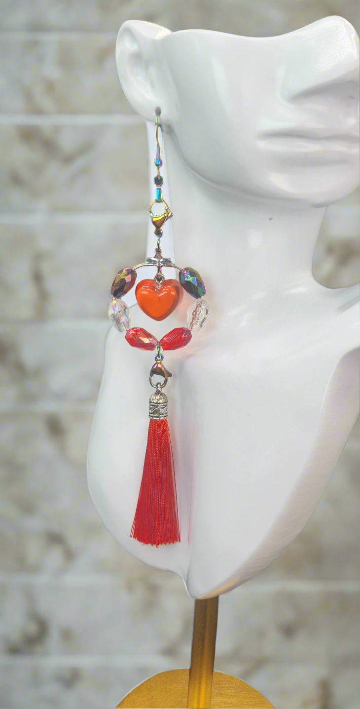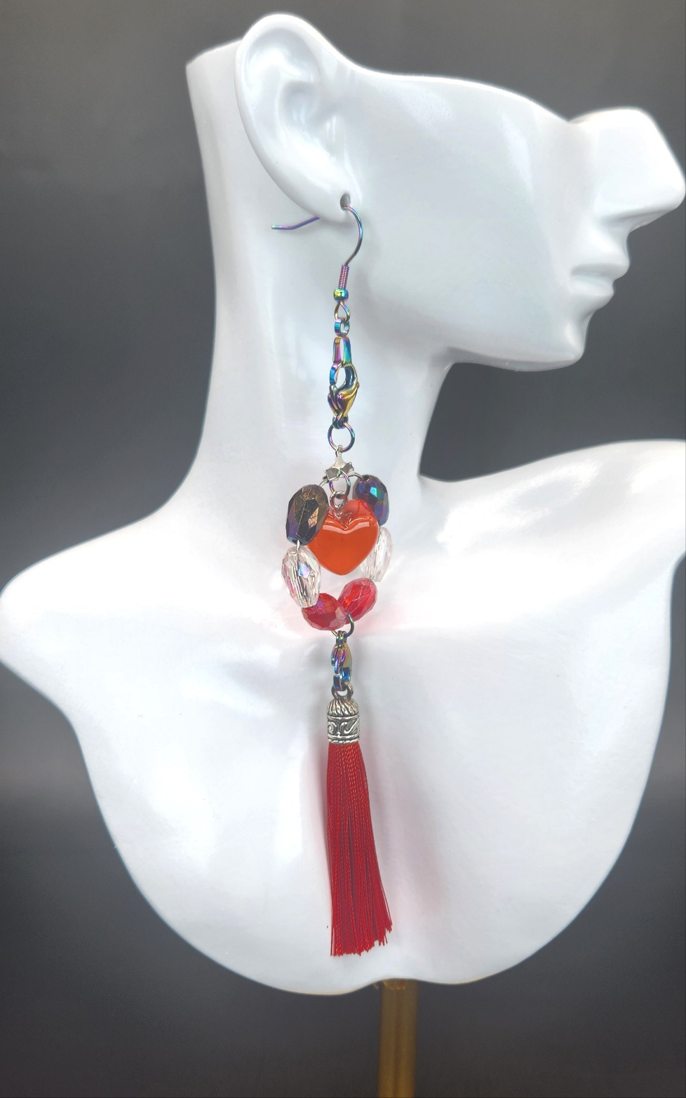 Wire hoop earrings and tassels designed with attractive iridescent hues: hook, jump rings, lobster clasp and beads are all iridescent to display a variable shift in light depending on the angle, showing a multi-dimensional color effect, illuminating rainbowlike colors! Small resin amber colored heart dropping down from the center of the hoop representing warmth.