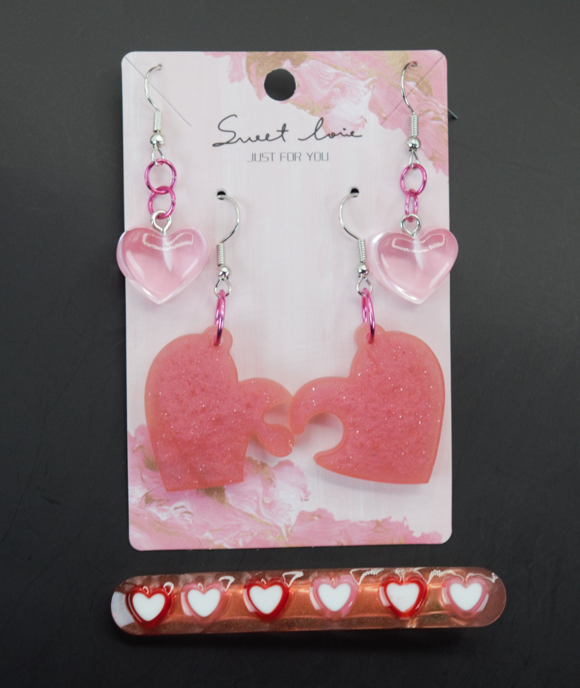 Nothing says I love "❤️'s" like a jewelry set with multiple hearts! This handmade fun loving set features two pairs of earrings and one hair clip. The first pair of dangle heart-shaped earrings are made from resin and are designed to interlock one another. The second pair of smaller dangle heart-shaped earrings are made from resin as well. Both earrings hang from stainless steel hypoallergenic hooks. The resin made hair clip is adorned and delicately placed with acrylic heart-shaped beads and attached to a clip with teeth for better gripping of the hair.