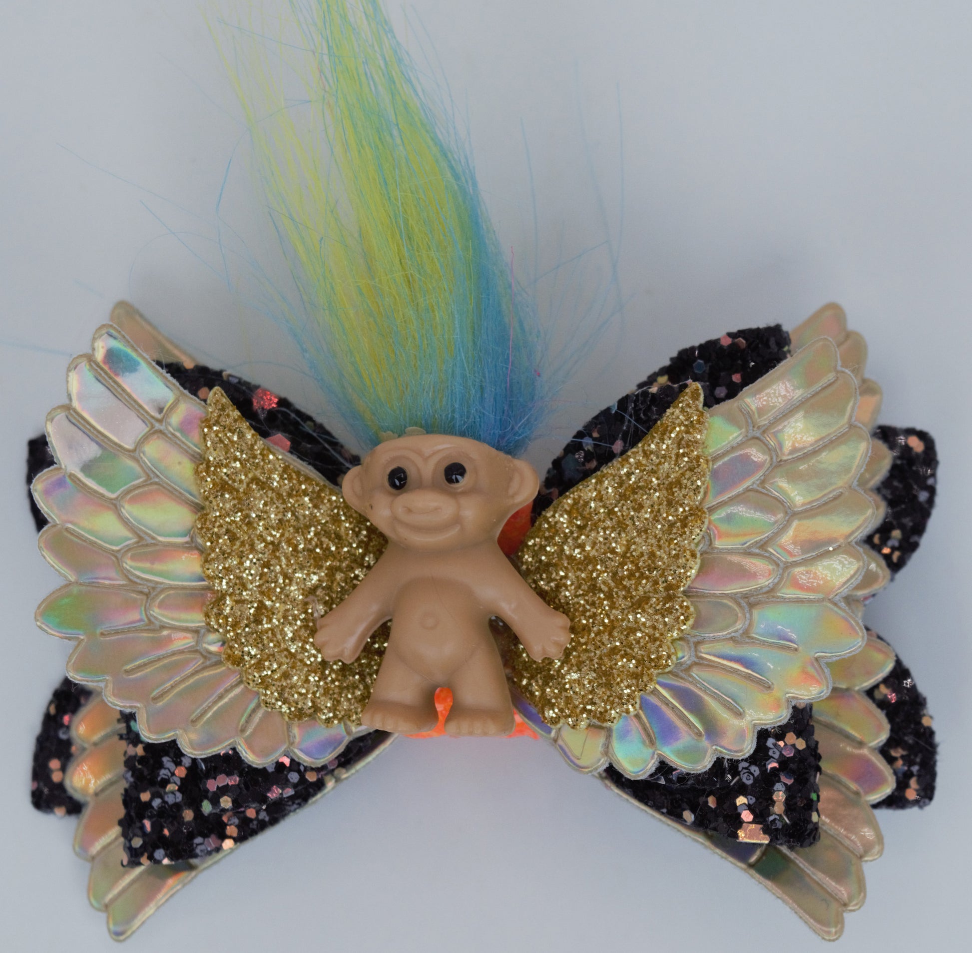 Show off your golden magic with this one-of-a-kind troll bow. Black hair bow with shimmery gold dots throughout. Two sets of wings: one iridescent gold, the second is gold with glitter. The wings and bow are both made from cloth. And alligator clip is attached to the back. The gold colored wings are certain to make you shine like a star. Perfect for toddlers, teens, or troll enthusiasts!