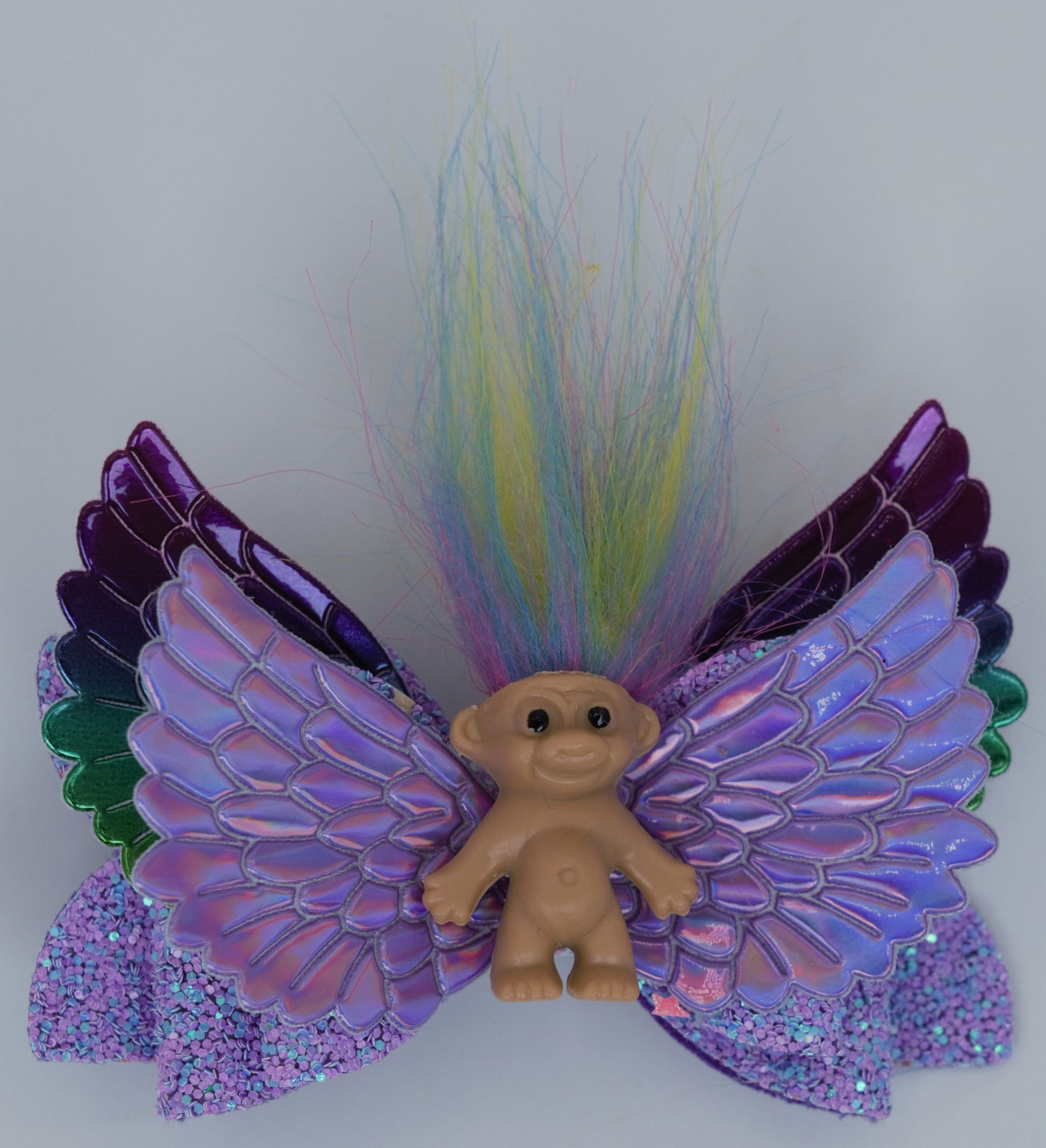 Add magic to your hair with this one-of-a-kind troll bow with purple and teal dots throughout, and lavender wings. Two different sets of wings: one iridescent lavender, the second is iridescent purple and green. The wings and bow are made from cloth. Alligator clip is attached to the back. Perfect for toddlers, teens, or troll enthusiasts!