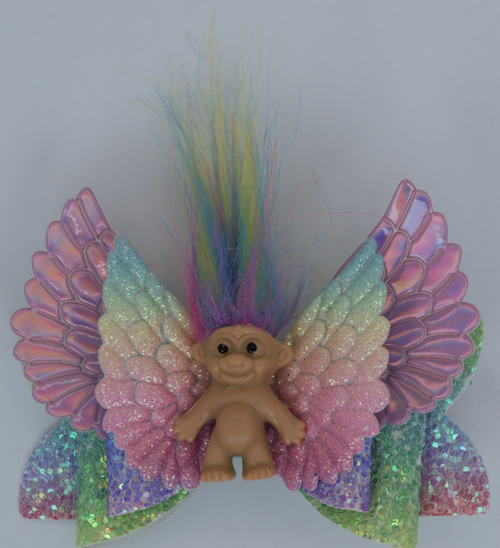 Add magic to your hair with this one-of-a-kind troll bow. The bow is multicolored with speckles of glitter throughout. Two sets of wings: one set is iridescent pink, the second pair is shimmery pastel. The wings and bow are both made from cloth. Attached to the back is an alligator clip. Perfect for toddlers, teens, or troll enthusiasts!