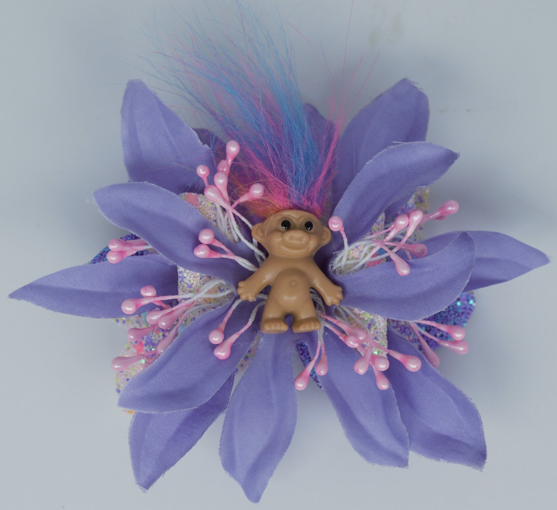 Unleash your magic with this one-of-a-kind troll flower bow. The flower and bow are both made from cloth. The bow has multicolored speckles throughout the material with pale purple flowers petals blooming around the bow. Faux anther and filament flower parts are added for a more realistic appearance. Attached to the back is an alligator clip. Perfect for toddlers, teens, or troll enthusiasts!