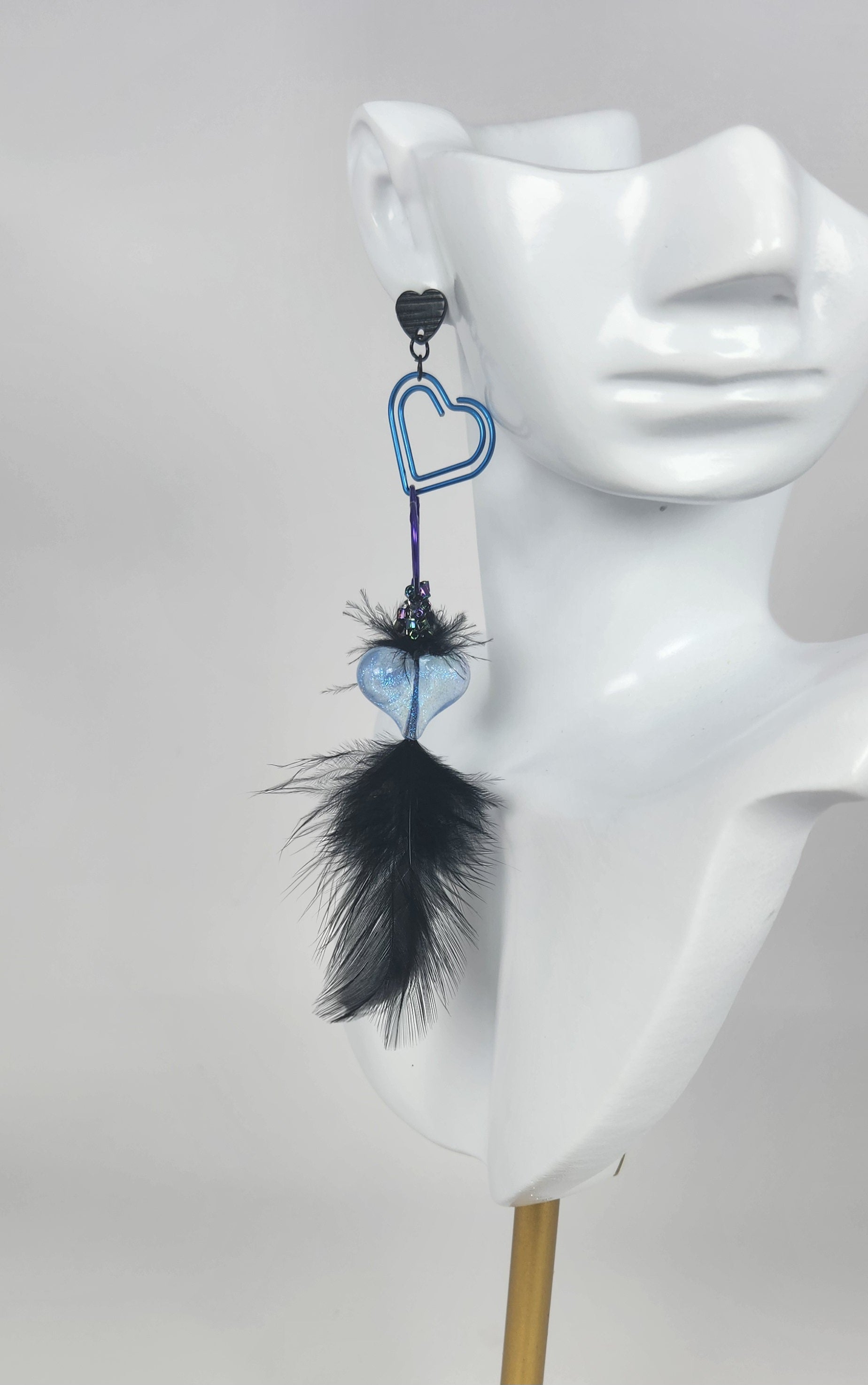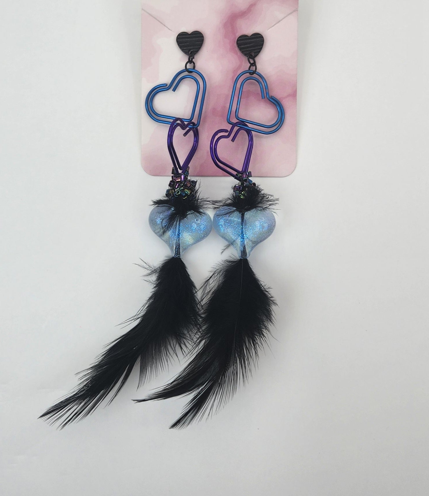 The earrings hang from a heart-shaped steel stud with two wire frame hearts below it. The frame hearts connect to the feather with resin and mini beads. The black faux feather pierces through the middle of a iridescent glitter acrylic heart.