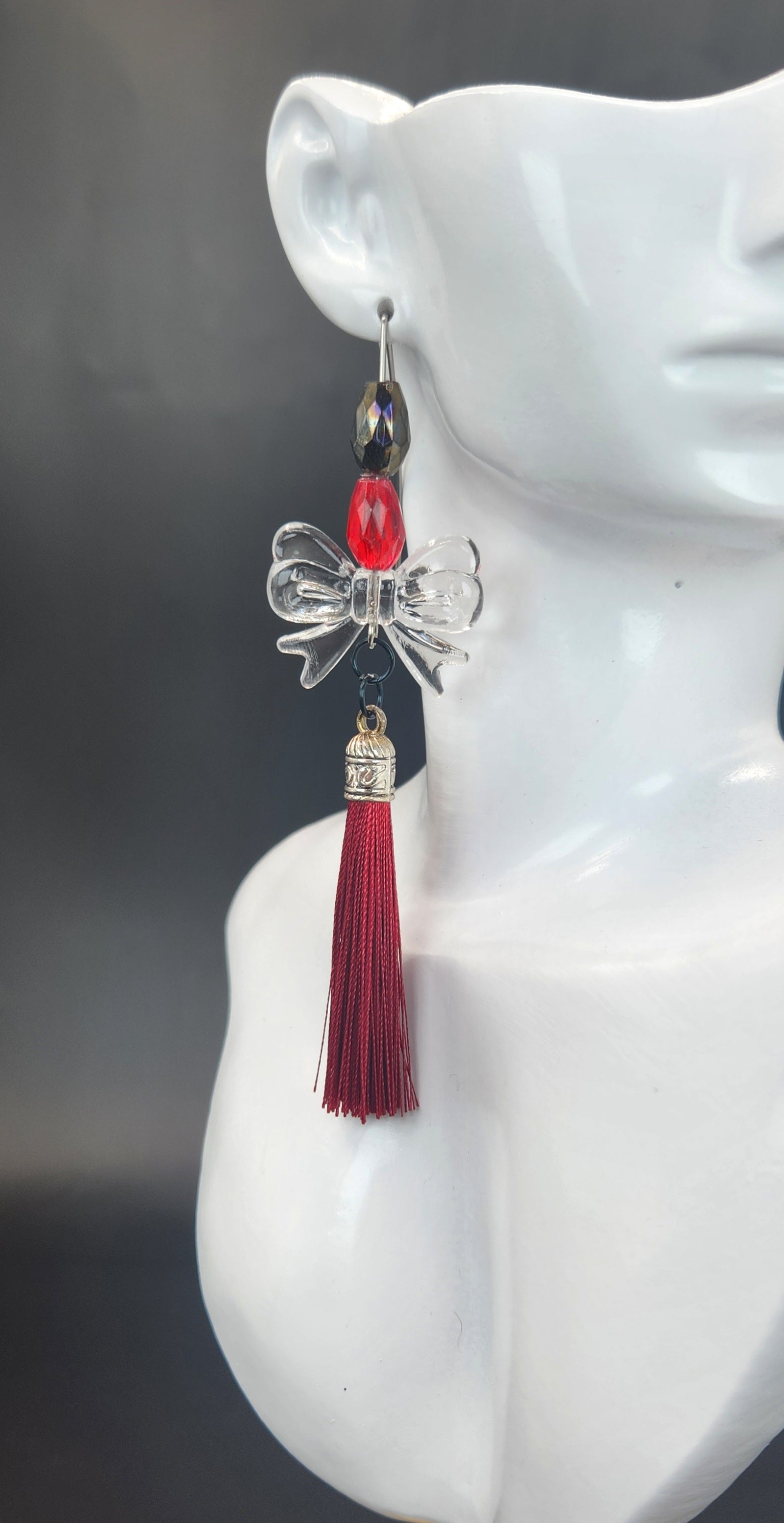 Handmade tassel earings hanging from a V-shaped Marquise stainless steel hook adorned with iridescent beads and one large clear bow bead.