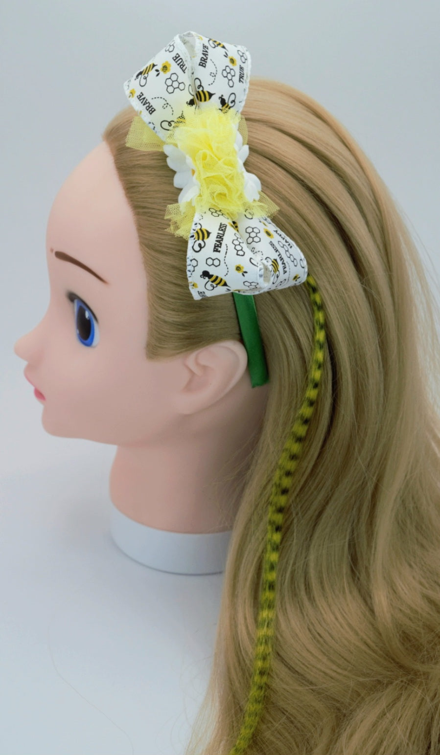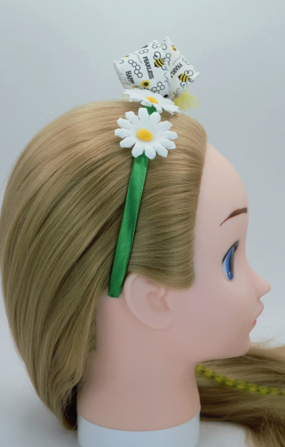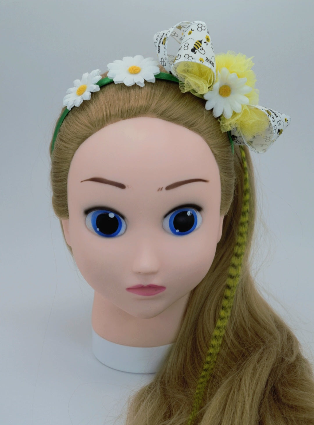 This adorable handmade bubble bee cloth hair bow attached to a headband with multiple daisy flowers is as sweet as honey! A strand of artificial hair hanging 14inches long from the bow which is the exact color and stripe pattern of a natural bee.
