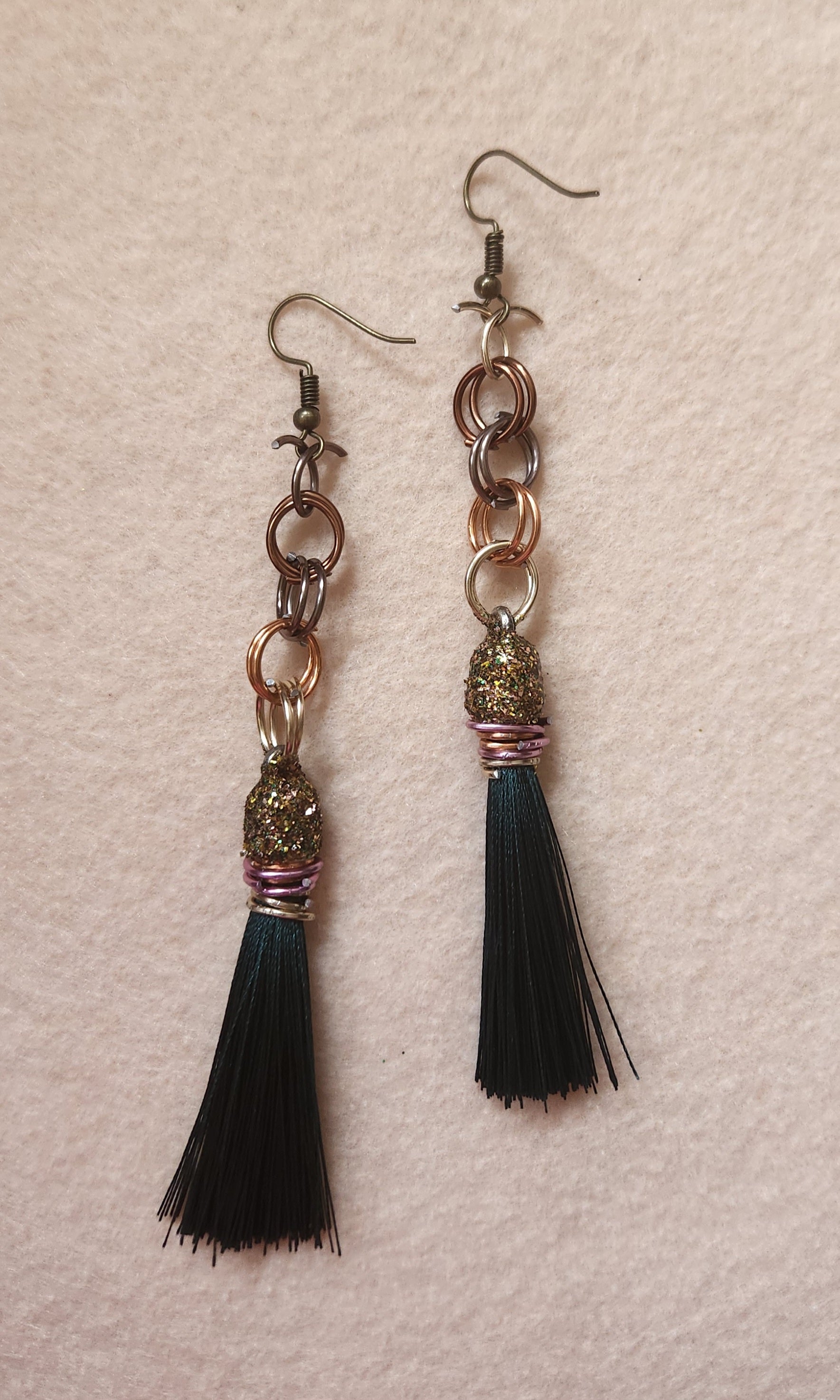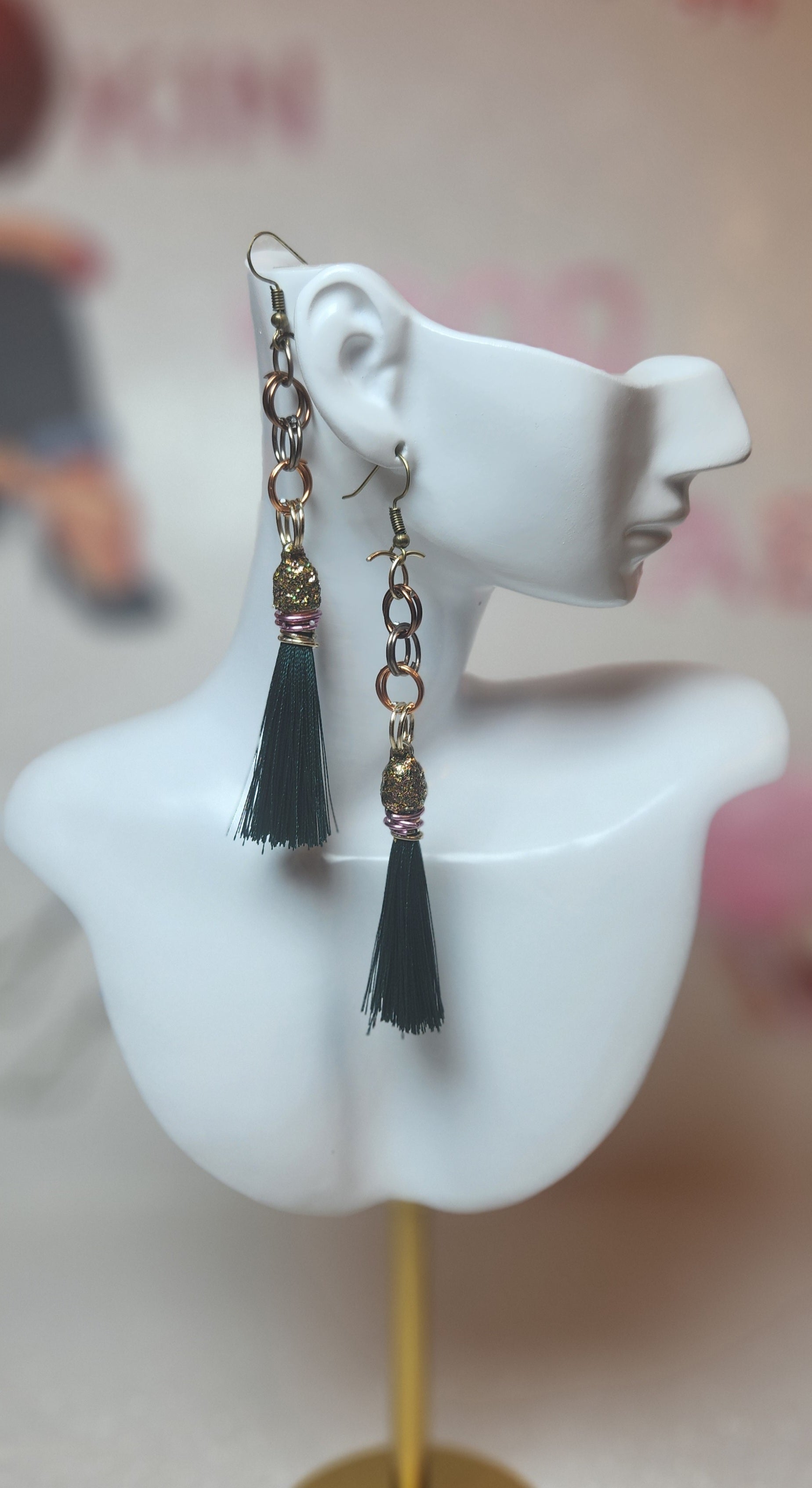 These forest green tassel dangle earrings with multi-colored rings are elegant and mature. Although they are multicolored, they are darker, more neutral tones which will make any excellent choice for an intimate evening out.