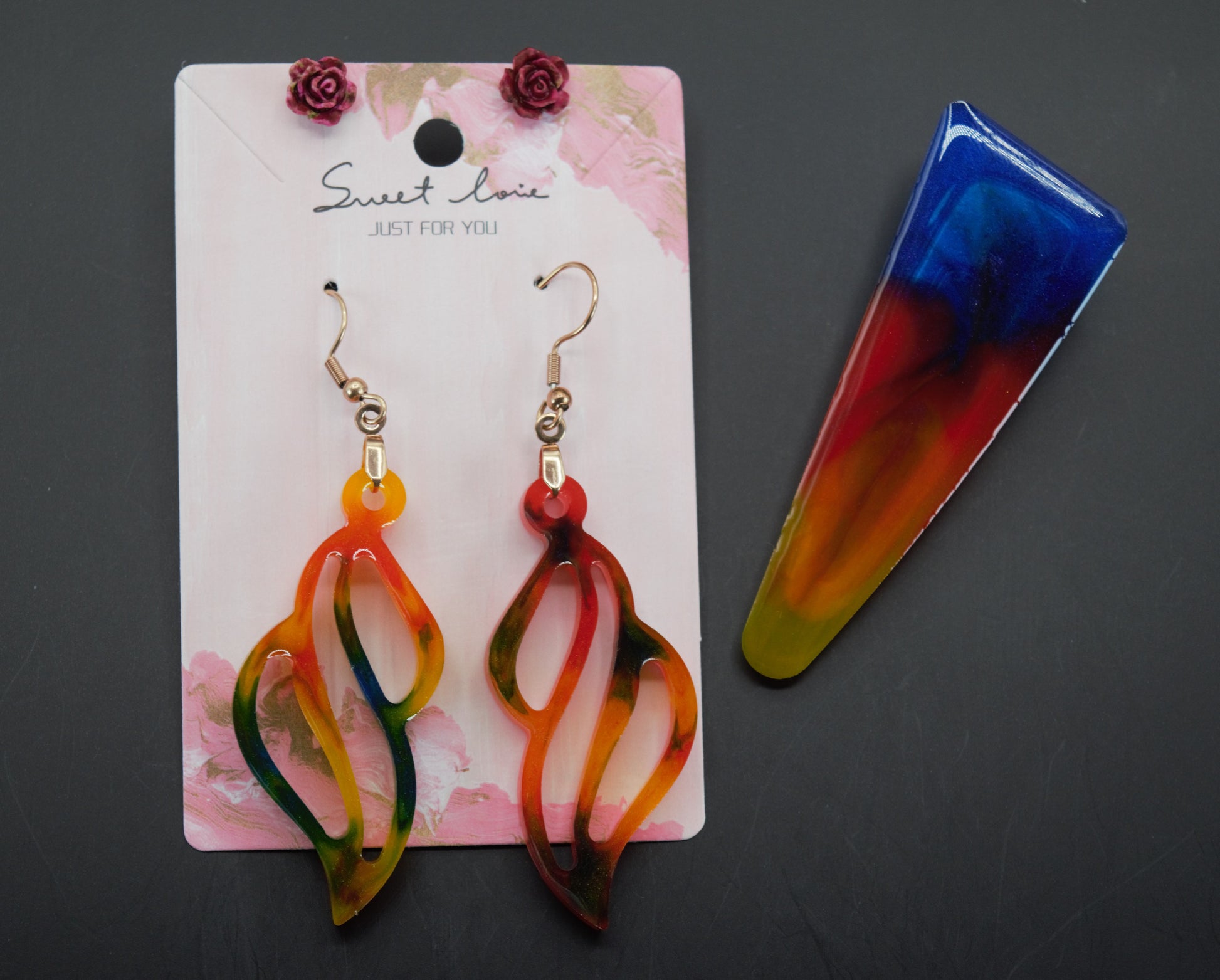 This handmade fun hippie set is perfect if you want to brighten up your style with a retro design and colors! This whole set is made from resin and features two sets of earrings and one hair clip. The first pair of earrings which mimic flames have swirls of colors that all mesh together to add a psychedelic flow hanging from stainless steel hooks. The second pair of earrings are small roses that also have swirls of multiple colors. The glossy multicolored hair clip is attached to an alligator clip with teeth for better grip.