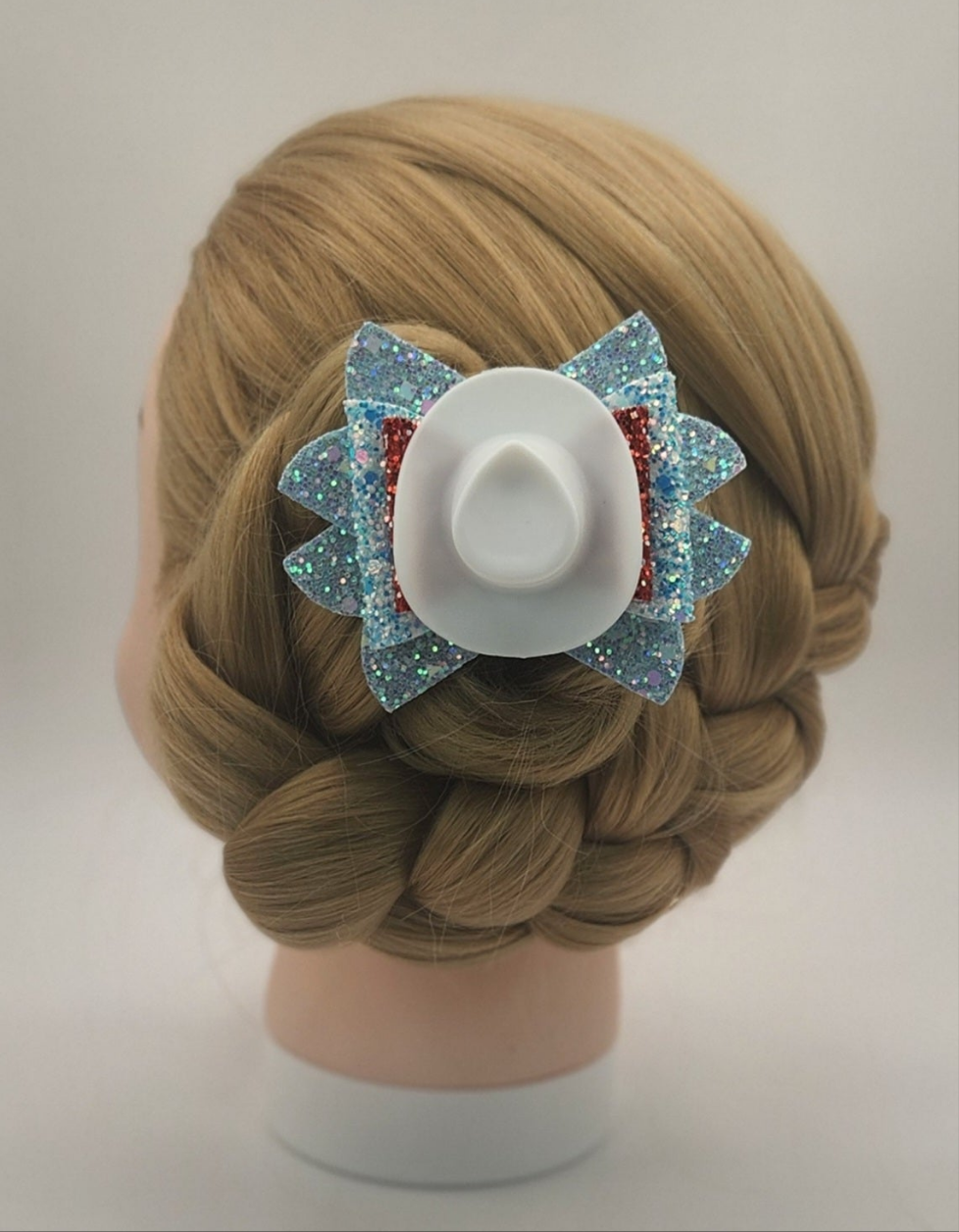 This fun handcrafted shimmery cloth red, white and blue cowgirl hat hair bow is a classic and shows off a girls true colors! Wearing this bow says American and proud! The clip attached to this bow is steel and has teeth for better grip.