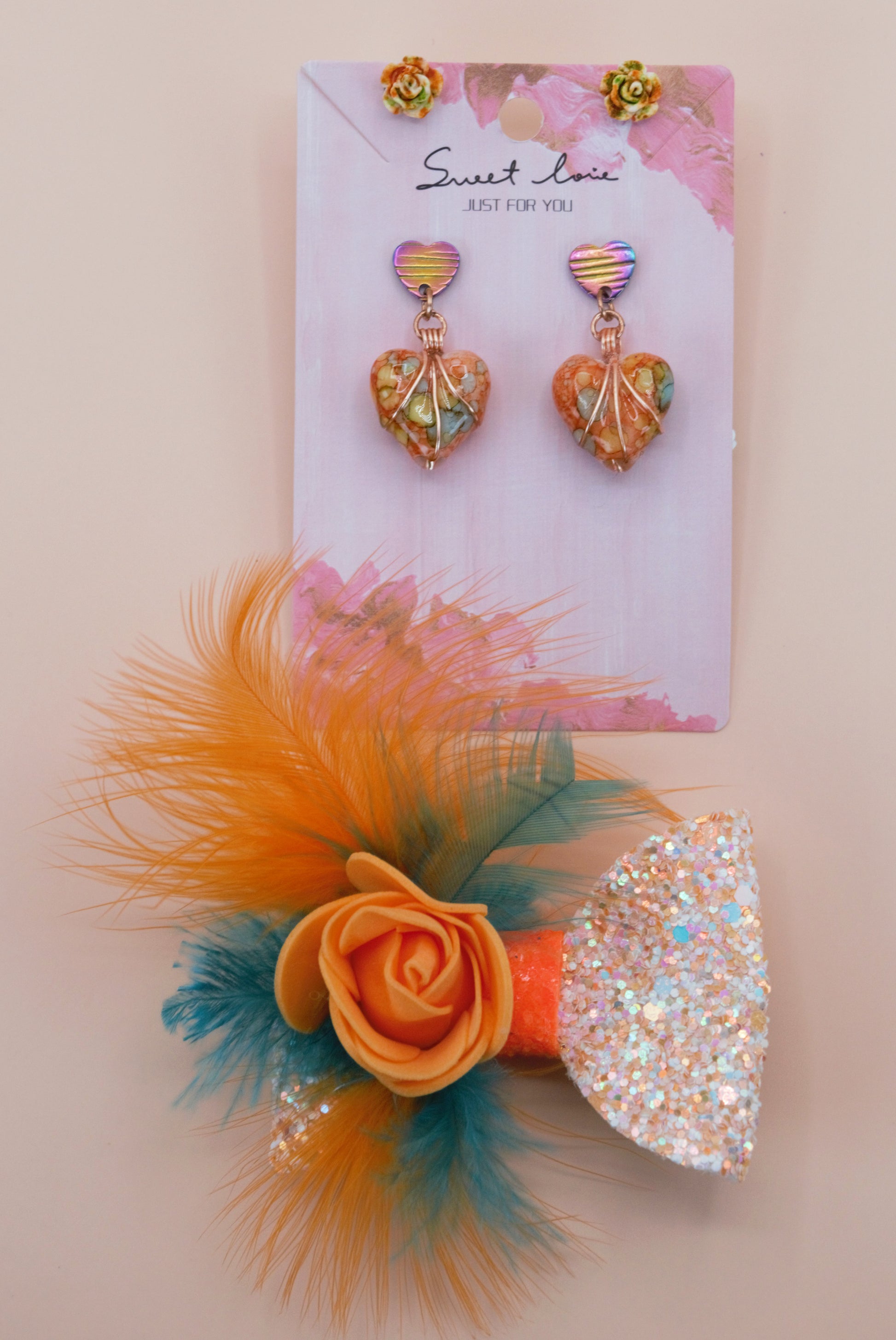 This handmade earring and feather bow set is designed to add class and sophistication to any young girl's appearance. This feather hair bow is perfect for any child who enjoys dressing up and adding some sass to their style. Please not that the feathers in this bow are faux. The orange flower is added for a feminine touch and made from styrofoam. The fun heart-shaped tie-dye earrings are wire wrapped through and around the heart. They hang from a steel heart-shaped stud. The second pair of earrings are tiny roses which are also tie-dye.